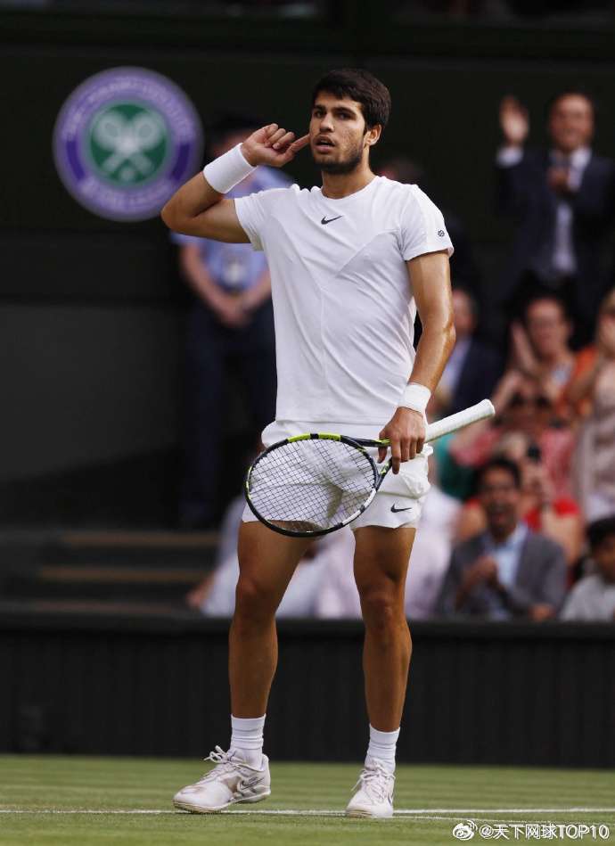 尽管第二盘稍有松懈被弗里茨扳回一城,但阿尔卡拉斯在关键分上的掌控令人叹服。第四盘抢七4-6落后时,他连救两个盘点,最终以8-6逆转取胜。四盘比分定格在6-4、5-7、6-3、7-6(6),阿尔卡拉斯成为公开赛年代第10位连续3年晋级温网男单决赛的选手。