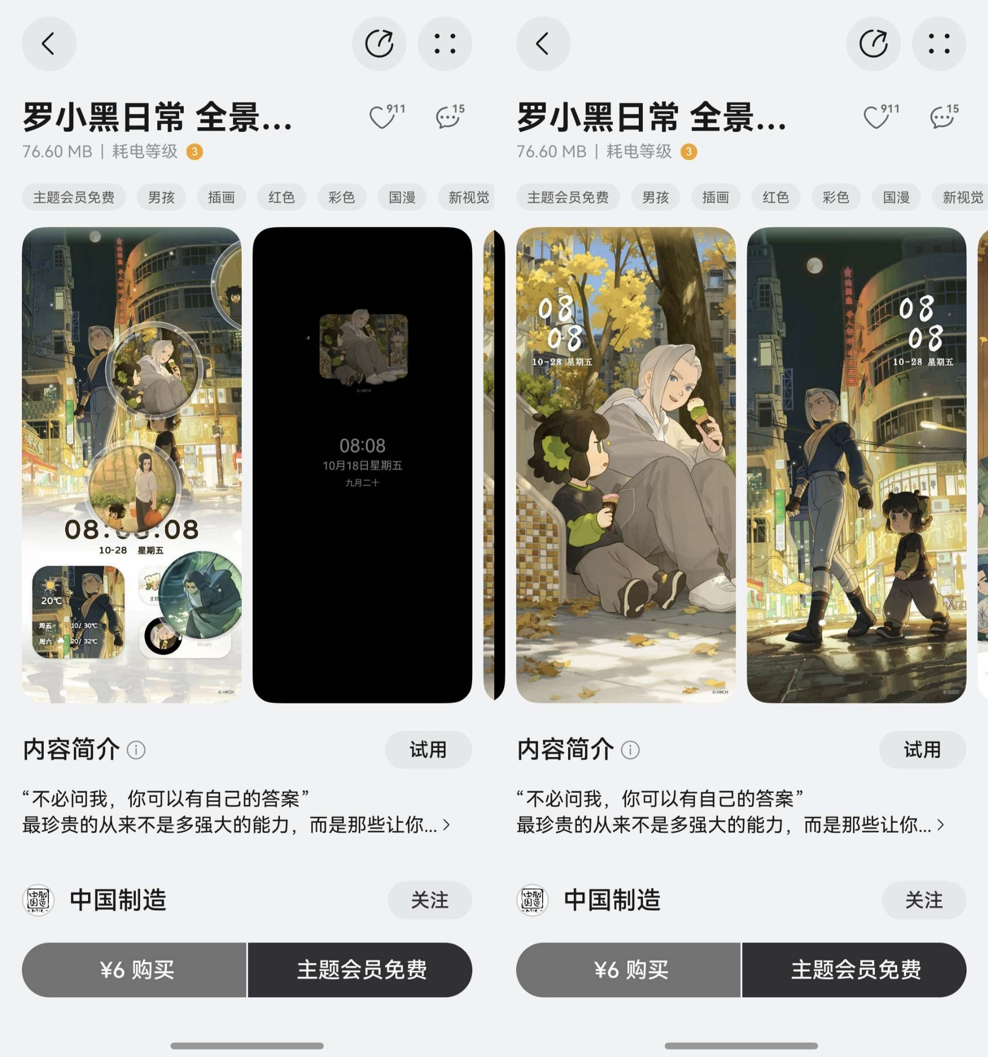 她笑着把华为主题APP推给我,我才发现这里还有超好多款好玩的IP主题。闺蜜同款《罗小黑日常 全景换图》主题里,双击锁屏可以切换不同画面,跟师傅散步的,师姐师弟小日常,每一个画面都经典又温馨,让本IP粉感觉小黑像是走进了我的日常。最绝的是“桌锁联动”,锁屏换张壁纸,桌面背景也跟着变,像给手机装了个全景小世界,每天都能沉浸式体验小黑带来的互动。