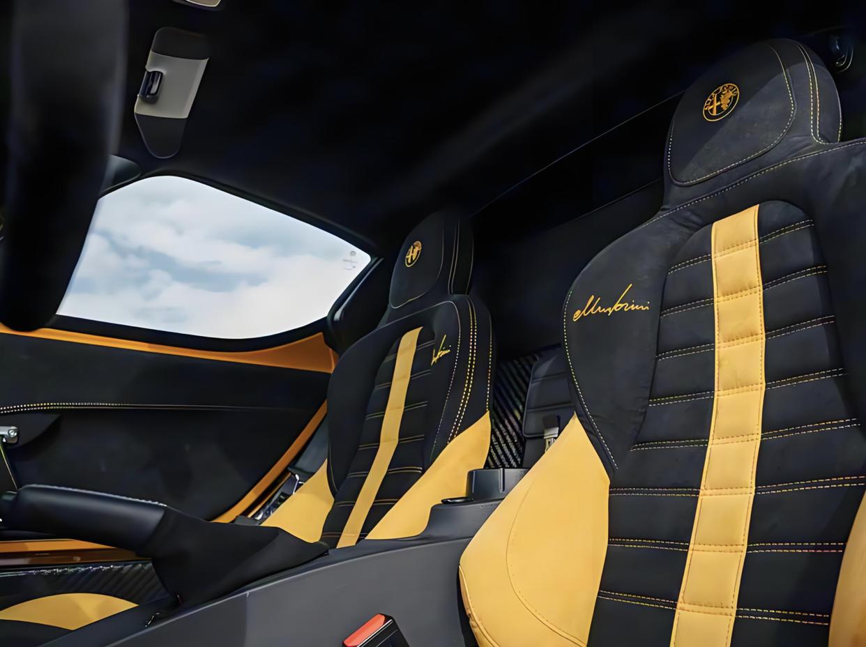 车身采用了双门硬顶跑车的结构,一体式碳纤维座舱。黑色的A柱和车窗四周的黑色装饰条形成了一个整体,打造出悬浮式车顶的立体效果。两个造型优雅的无边框车门搭配着翻盖式的椭圆形门把手,造型十分精致、优雅。两侧配备了固定式的倒车镜,黑色的立柱和水滴形后壳都采用了碳纤维材质,提升了整车的质感。前18英寸、后19英寸的多辐式轮圈经过熏黑处理,匹配了米其林Cup2的205/40 R18、235/35 R19轮胎。车尾与法拉利599GTO有着异曲同工之妙,配备了两个正圆形的尾灯,融入了圆环形的光源,夜间店里更加型面。黑色碳纤维材质的底部扩散器搭配着中置双出的圆形排气尾喉,强化了整车的运动气息。