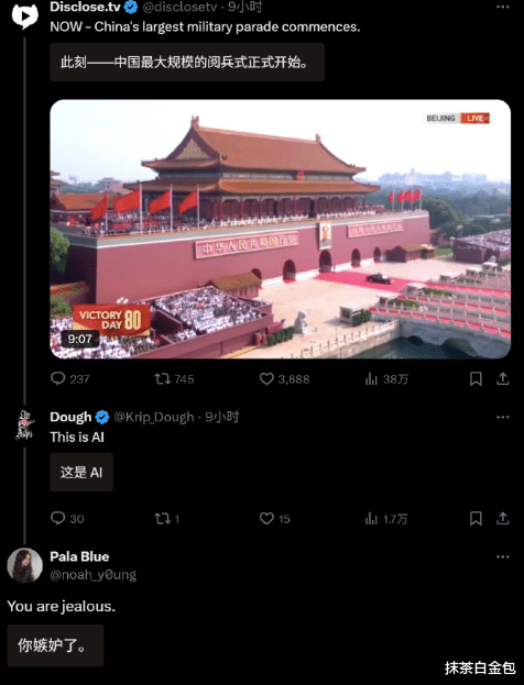 一边是中国网友调侃郭导,另一边大洋彼岸的美国人在看到我们的阅兵仪式后,集体在网上破防,一次又一次反复强调:“AI,这是AI!”死都不承认中国的科技水平早就超越了不可一世的老美。这就是人性,人没有办法接受自己无法理解的事物。