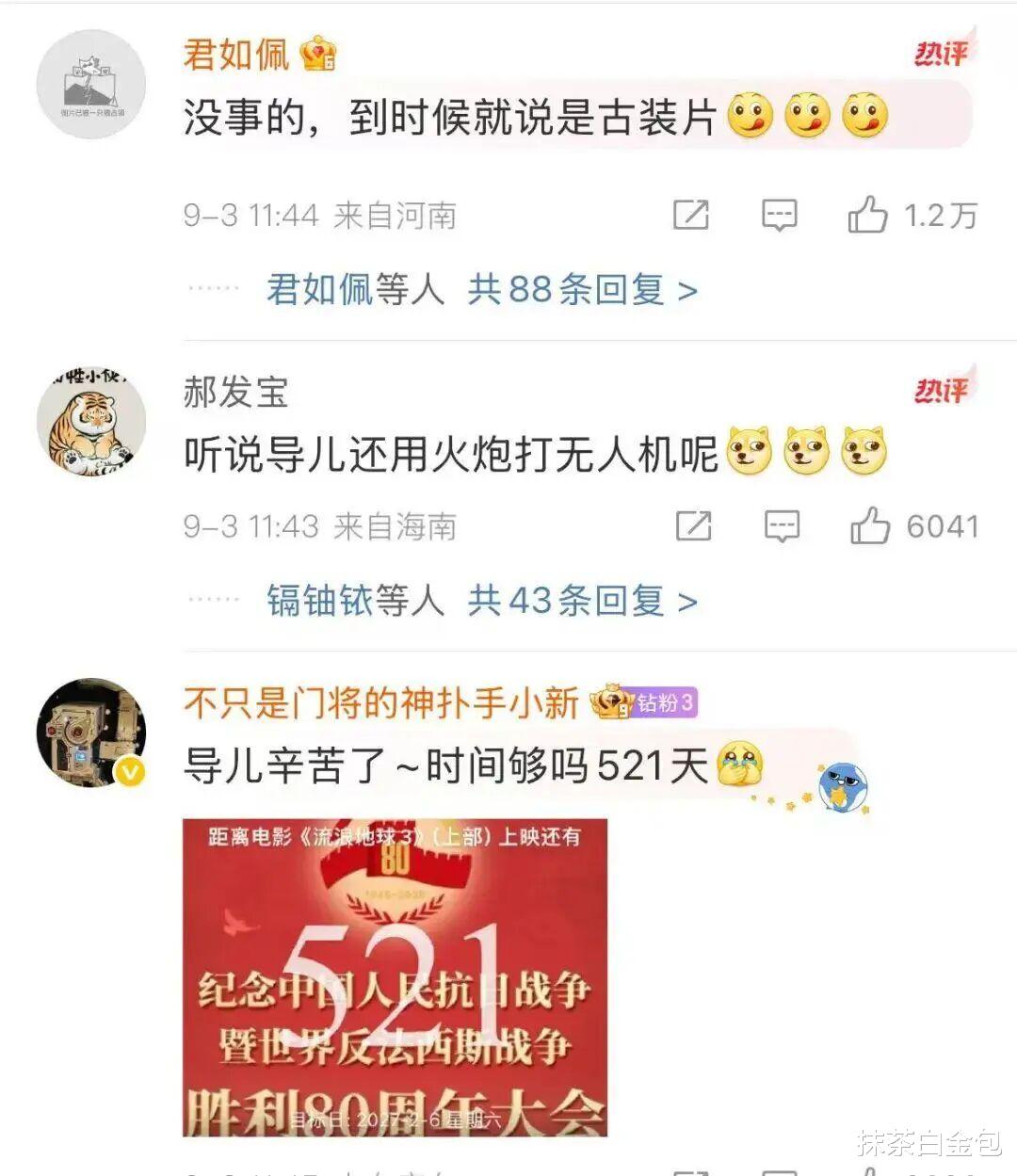 除了表达自豪之情,还有一部分影迷向《流浪地球3》的郭帆导演送上同情和慰问:郭啊,让你拖更让你拖更!这下好了,现实世界里的武器已经远远走到科幻电影前头去了,看你怎么办!