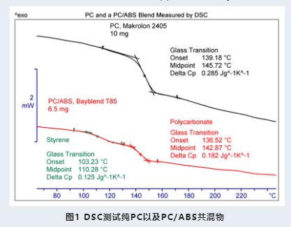 另外,根据比热容的改变量,还可以估算PC/ABS中各组分的含量。PC/ABS中的PC在发生Tg前后,比热容变化(delta Cp)为0.182J/g·K,纯PC在发生Tg前后的delta Cp为0.285J/g·K,两者相除后计算得到PC的含量大约为64%。
