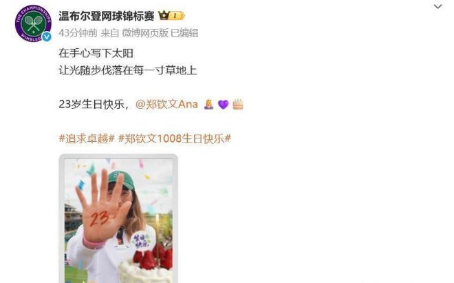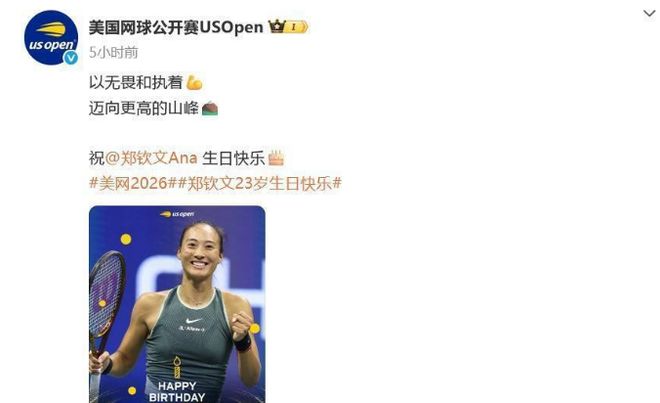美网:“以无畏和执着,迈向更高的山峰。祝郑钦文生日快乐。”