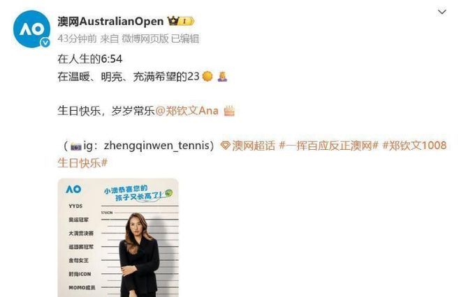 澳网:“在人生的6:54,在温暖、明亮、充满希望的23。生日快乐,岁岁常乐郑钦文。”