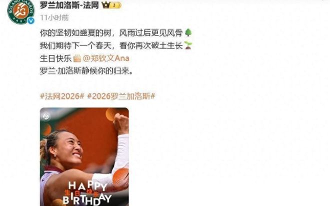 法网:“你的坚韧如盛夏的树,风雨过后更见风骨。我们期待下一个春天,看你再次破土生长。生日快乐郑钦文,罗兰-加洛斯静候你的归来。”