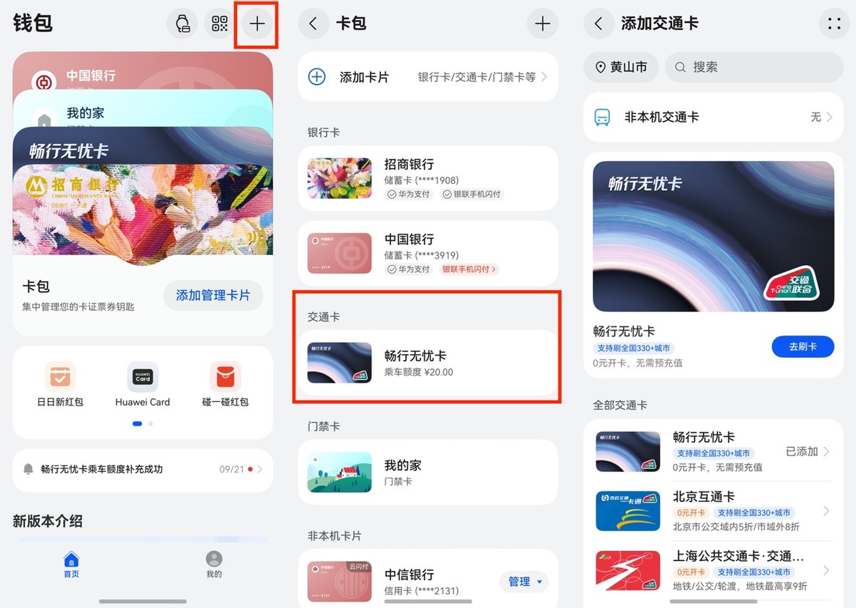 那么如何开通这张卡呢?很简单!用户只需在鸿蒙5的设备上打开钱包APP,点击右上角加号进入添加卡片界面,选择交通卡类别中的畅行无忧卡,按照提示操作即可完成激活。而且开通后我们也无需预充值,这张卡采用先乘后付的结算模式,乘坐后系统会自动从你绑定的支付账户扣款,有效避免了因忘记充值而无法乘车的尴尬瞬间。