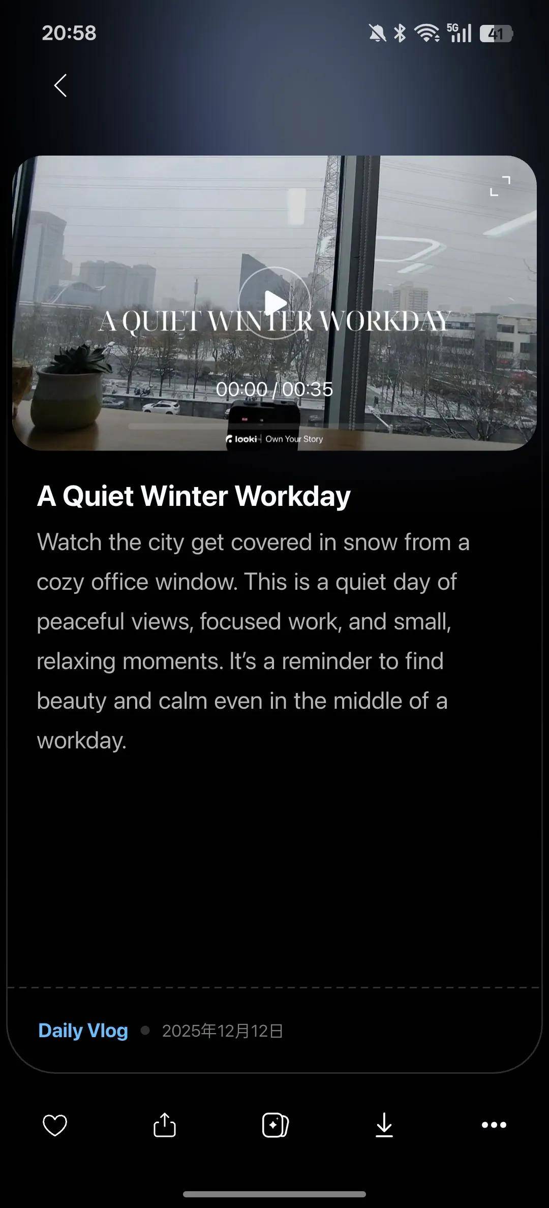 目前,Looki 交付给用户最显性的功能是「AI 自动剪辑」。它精准切中了那些热爱记录、却被后期剪辑劝退的用户痛点。用户在佩戴拍摄的同时,Looki 的算法自动识别一天中的高光时刻,自动生成有叙事逻辑的 Vlog。