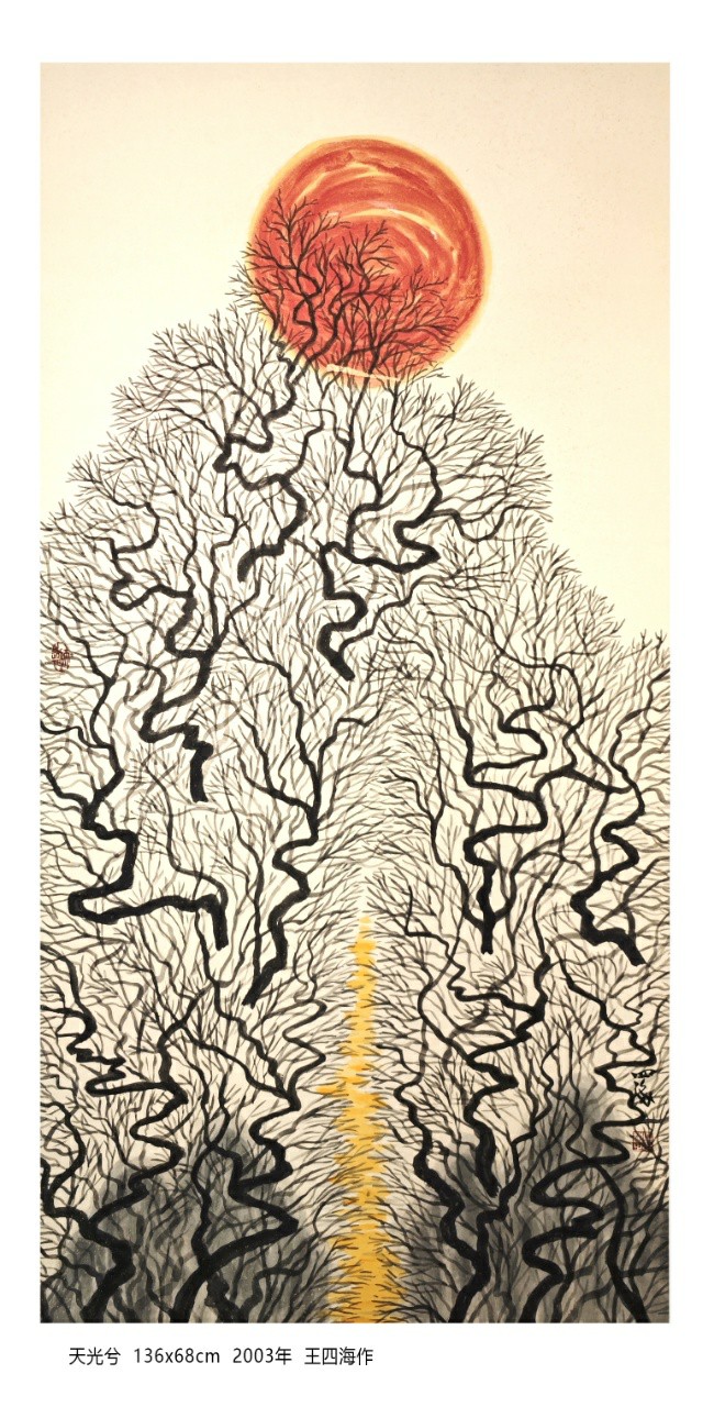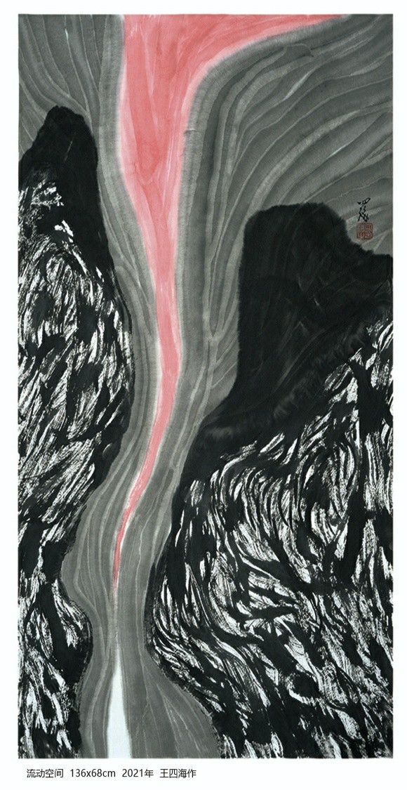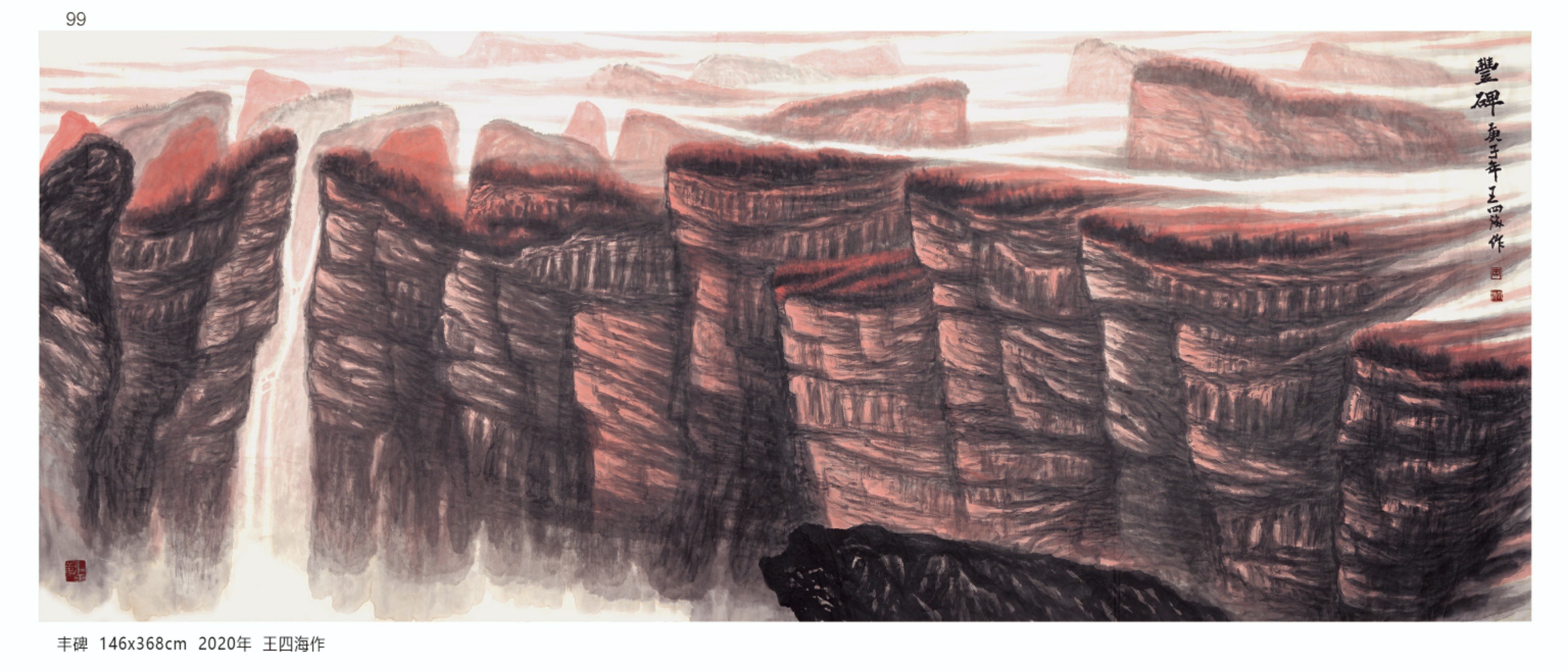 王四海从事装帧艺术35年的经历以及50多年来对艺术的深挖探索,使他对当代艺术有了不同的解读和认知。作为传统文人画精神的当代践行者,王四海的创作深深根植于中华文化的基因之中,他融书画于一体形成了鲜明的个人风格。作为艺术工作者,他在退休之后依然保持着旺盛的创作力《雪山图》、《丰碑》等一批近期创作的画作深入人心。从画面中又可以看出他不拘旧法大胆用墨、用色,把想象与美学用于笔端,形成了通变有度、自成一格的画风。他用融贯东西的视觉语言,呈现传统笔墨与当代审美交融的艺术探索,引发业界广泛关注。