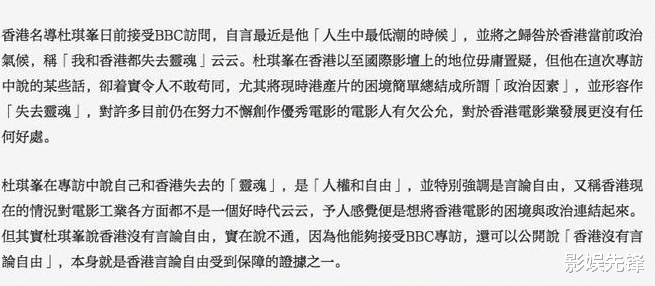就在最近,英国广播公司采访了杜琪峰,在采访中也和杜琪峰聊起了现在的香港电影。
