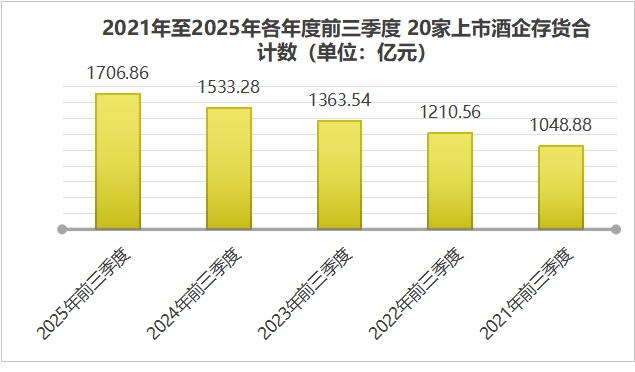 2025年三季度末,20家上市酒企存货合计1766.86亿元,同比增长11%。与2021年前三季度相比,四年间增长63%。