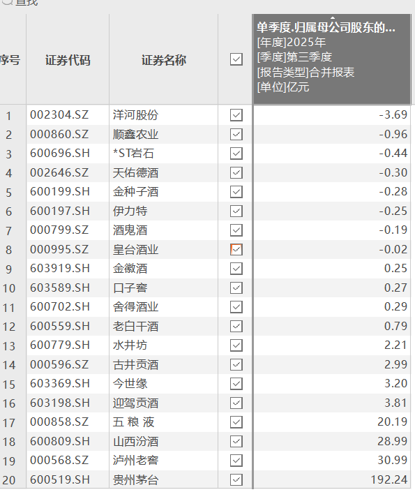 (2025年第三季度20家酒企归母净利,图源:choice)