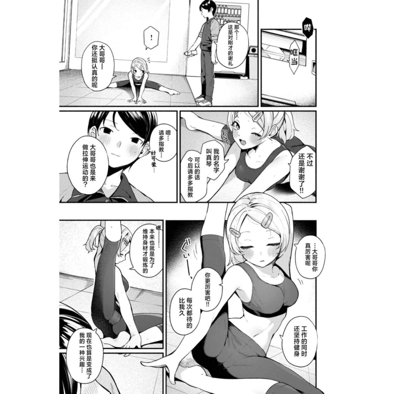 男主想着先站旁边等女主结束好了,结果女主看出了男主的意图,并告诉他自己已经差不多了要去练其他器材了把这个让给男主,而且女主似乎很早之前就注意到男主了,因为她知道男主已经一个星期没来健身,男主被揭穿不免有些尴尬,但是也正因此他俩熟络起来,女主告诉男主自己叫真琴。