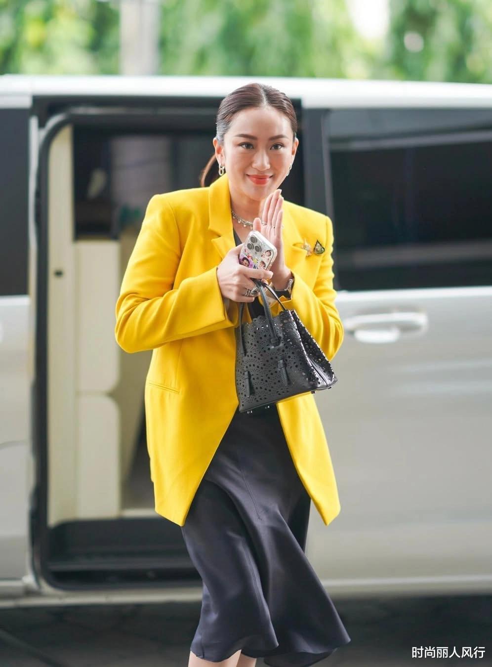 职场MM真是可以借鉴一下佩通坦的各种造型,像这身黑色的裙子配上嫩黄色的小西装,这样的风格也是很显干练。而手上拎着的这只包包也是价格不菲。
