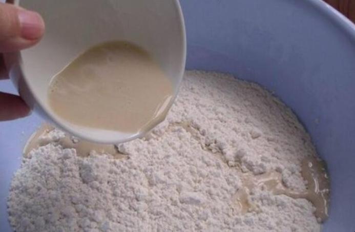 之后便把酵母粉水倒在面粉之中,注意一定要边倒边用筷子搅拌面粉,目的为了面粉与酵母粉充分的融合。