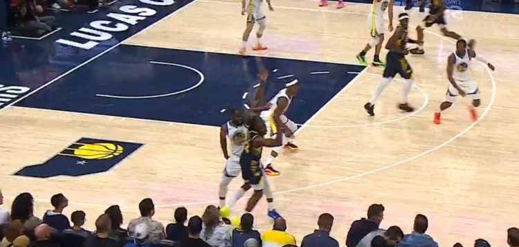 比赛还剩下44秒时,步行者发动进攻。裁判报告指出,格林在身边没有明确防守人的情况下在禁区待的时间过久,应该吹罚防守三秒违例,步行者得到一次罚球机会。