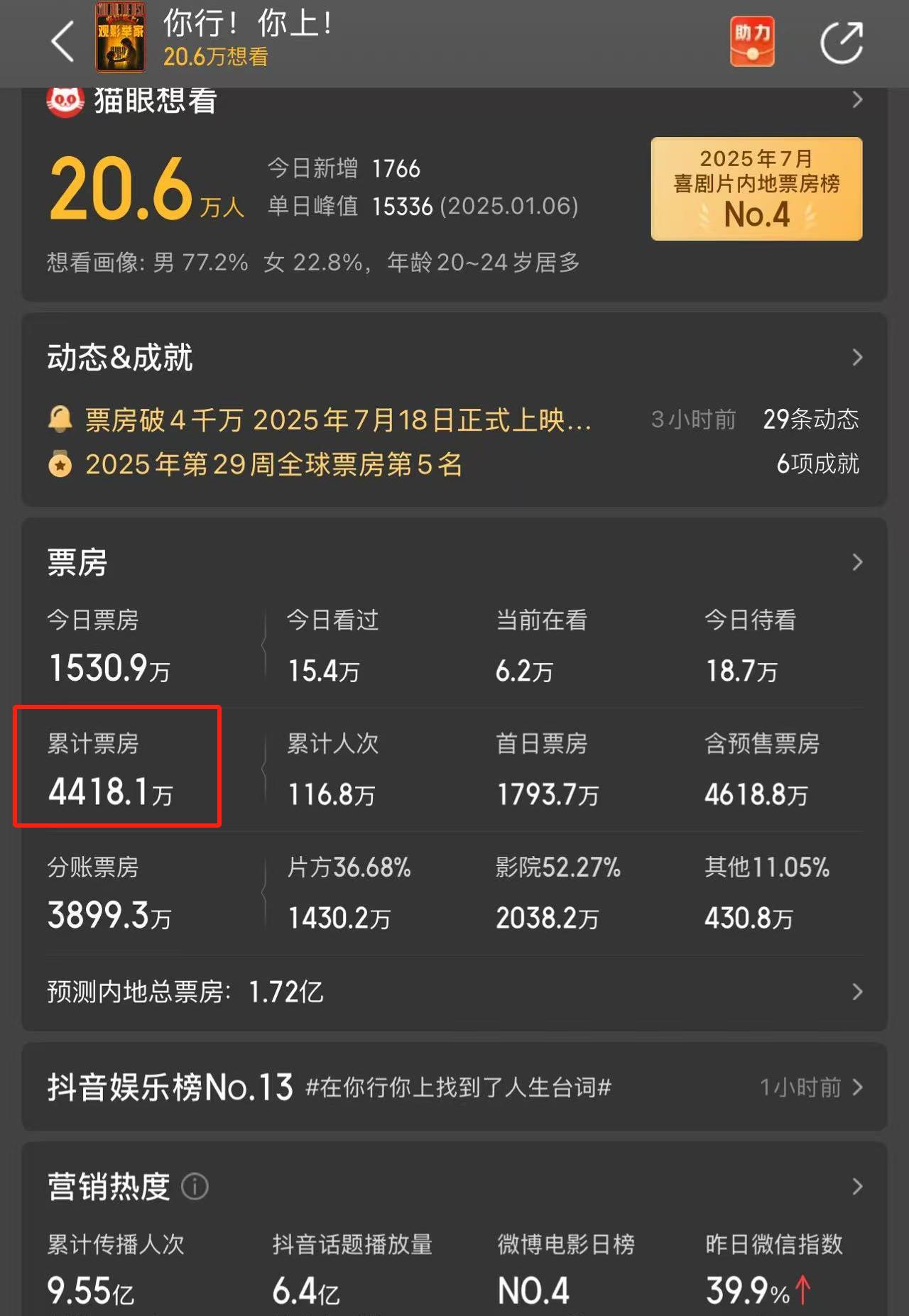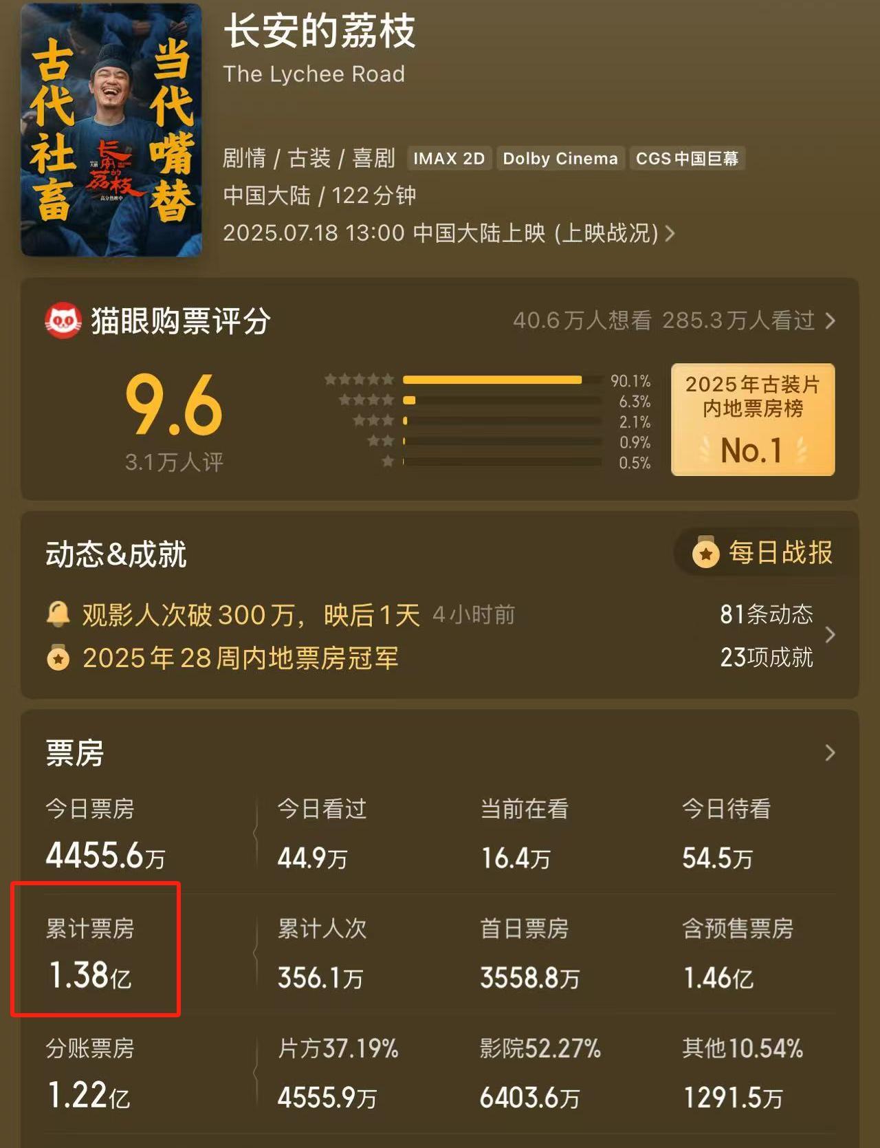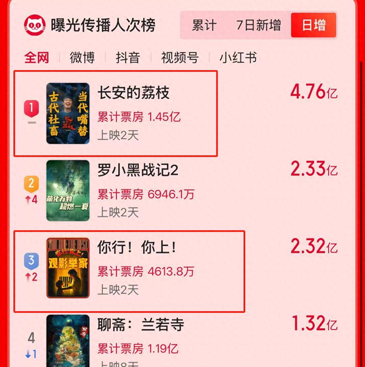 《长安的荔枝》那票房走势,简直就像坐了火箭一样,上映首日排片占比超过了23%,票房直接超过9000万元,电影加上预售和首映,很快就突破了一亿大关。这成绩,在暑期档那可是相当亮眼了。而《你行你上》就有点惨了,上映首日票房才1700万左右,两天下来总票房也就4000多万,和《长安的荔枝》比起来,那真是差了十万八千里呀。