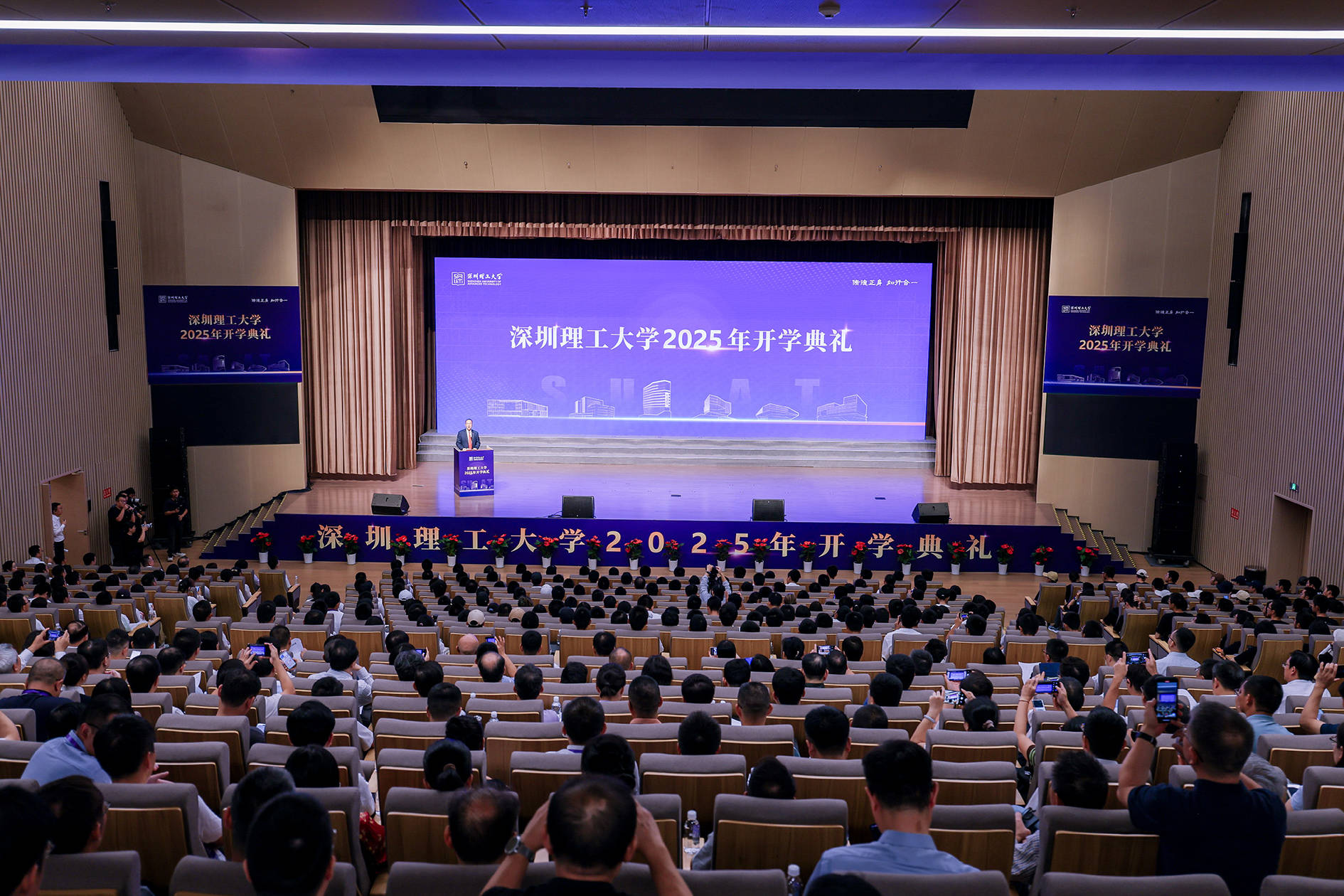9月29日,在成立一周年之际,深圳理工大学举行了一场“仪式感拉满”的开学典礼。深圳市委组织部、深圳市人才工作局、深圳市委党校、深圳市委党史文献研究室、深圳市教育局、深圳市水务局、深圳市城管局、共青团深圳市委员会、深圳市建筑工务署、光明区政府、重庆市人民政府驻广东办事处、内蒙古自治区教育厅等单位领导,甬江实验室、银星投资集团等科研院所、企业代表以及部分高校代表与深圳理工师生齐聚一堂,一千余人到场共同见证了这场盛会。