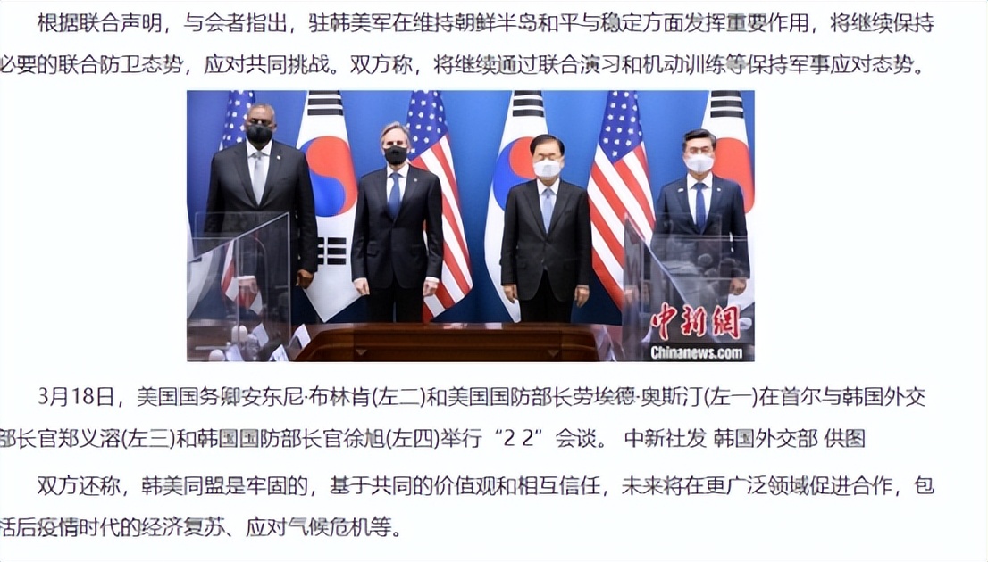 2021年韩美“2+2”会谈的时候曾有表态,美韩同盟是基于共同价值观和相互信任的伙伴关系,大致意思是美方尊重韩国意愿,但前提是必须确保同盟的防御能力不受影响。