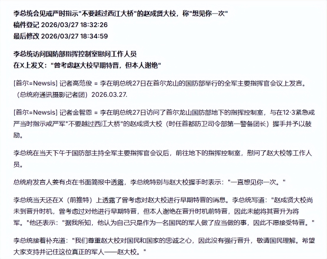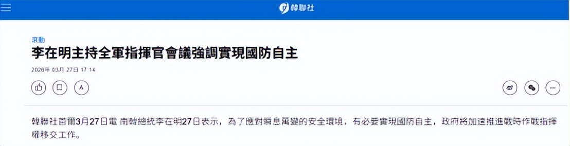 【信源:央视新闻2026-3-27韩国总统李在明召开全军会议,强调加速收回战时指挥权