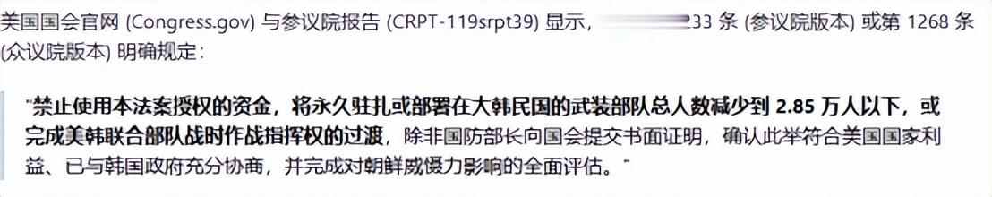 此外,美国国会通过的2026财年《国防授权法案》里,明确规定了国防预算不得用于削减2.85万驻韩美军!