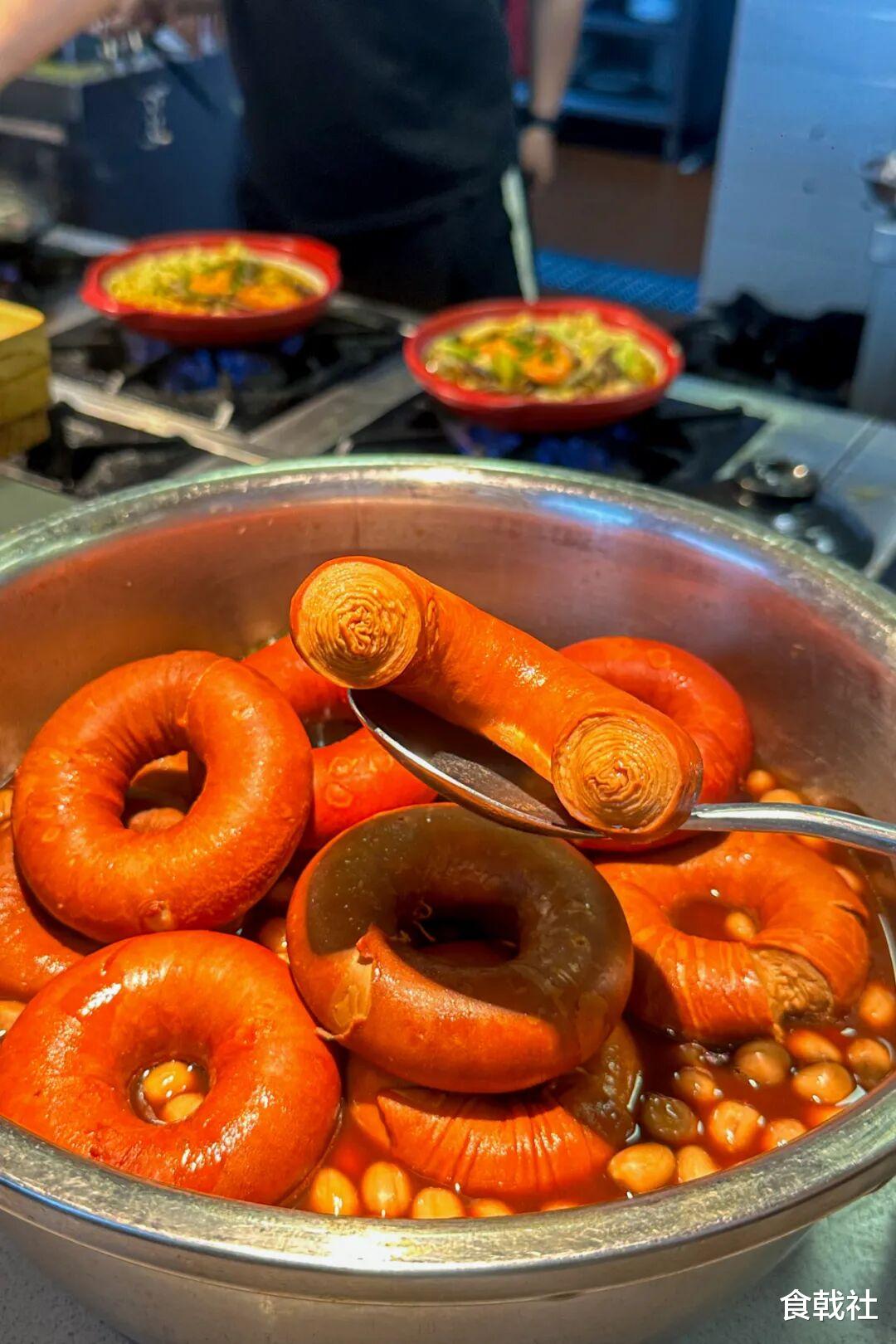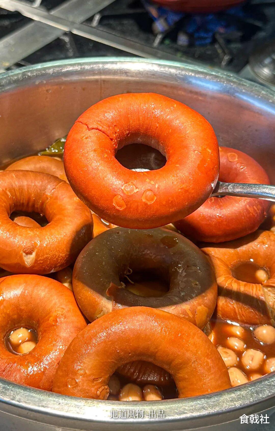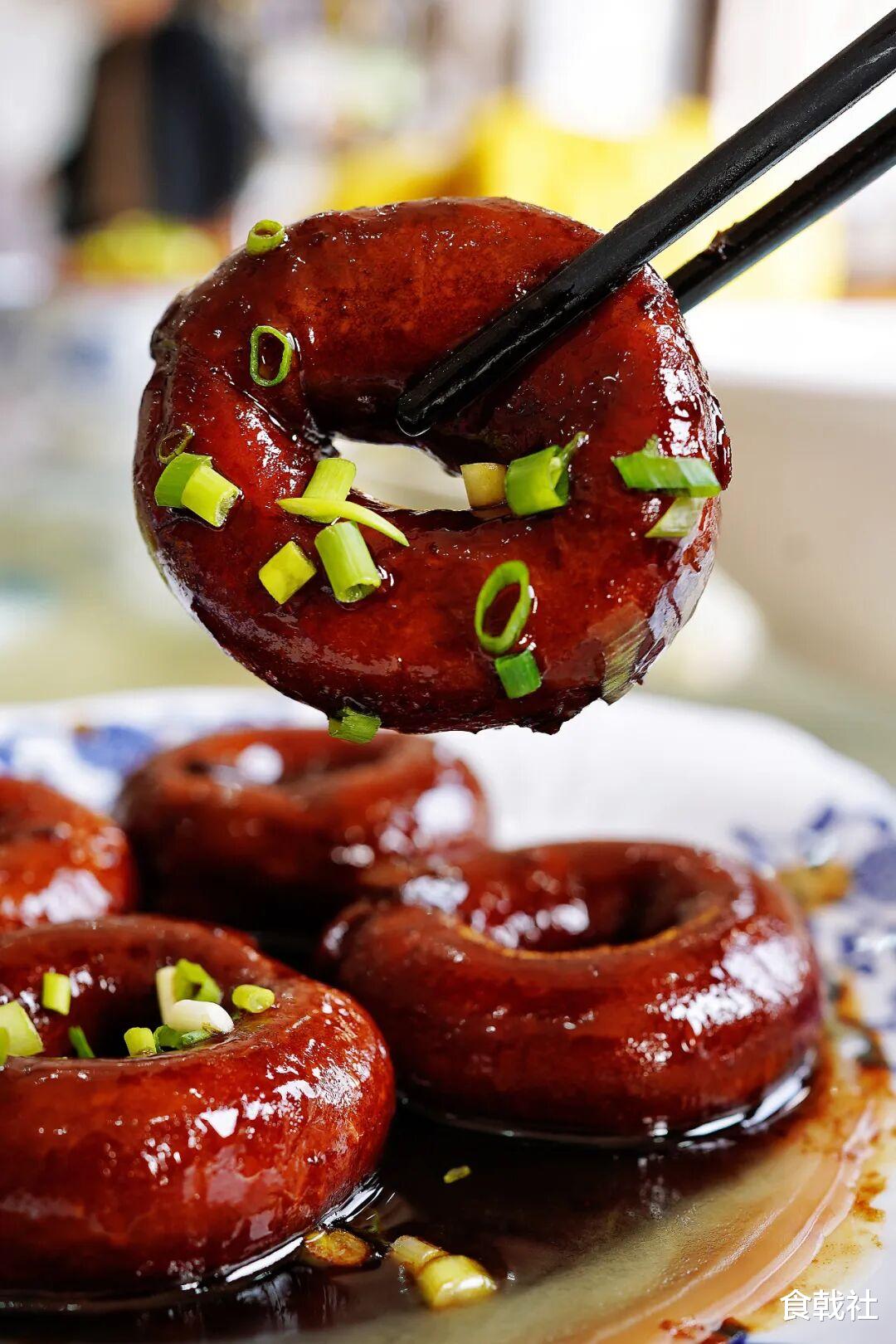 但在福建小肠的形态里,要说最费功夫,也最特别的,还得是套肠,将小肠巧妙地层层相套,最终形成一个完整的环状“面包圈”,切片后切面如同心圆,吃起来口感扎实,有层层递进的嚼劲和鲜香。吃法也有很多,能卤后独当一面作为下酒的硬菜,也能煮汤、炒菜,沁入到福建人的日常饮食中。