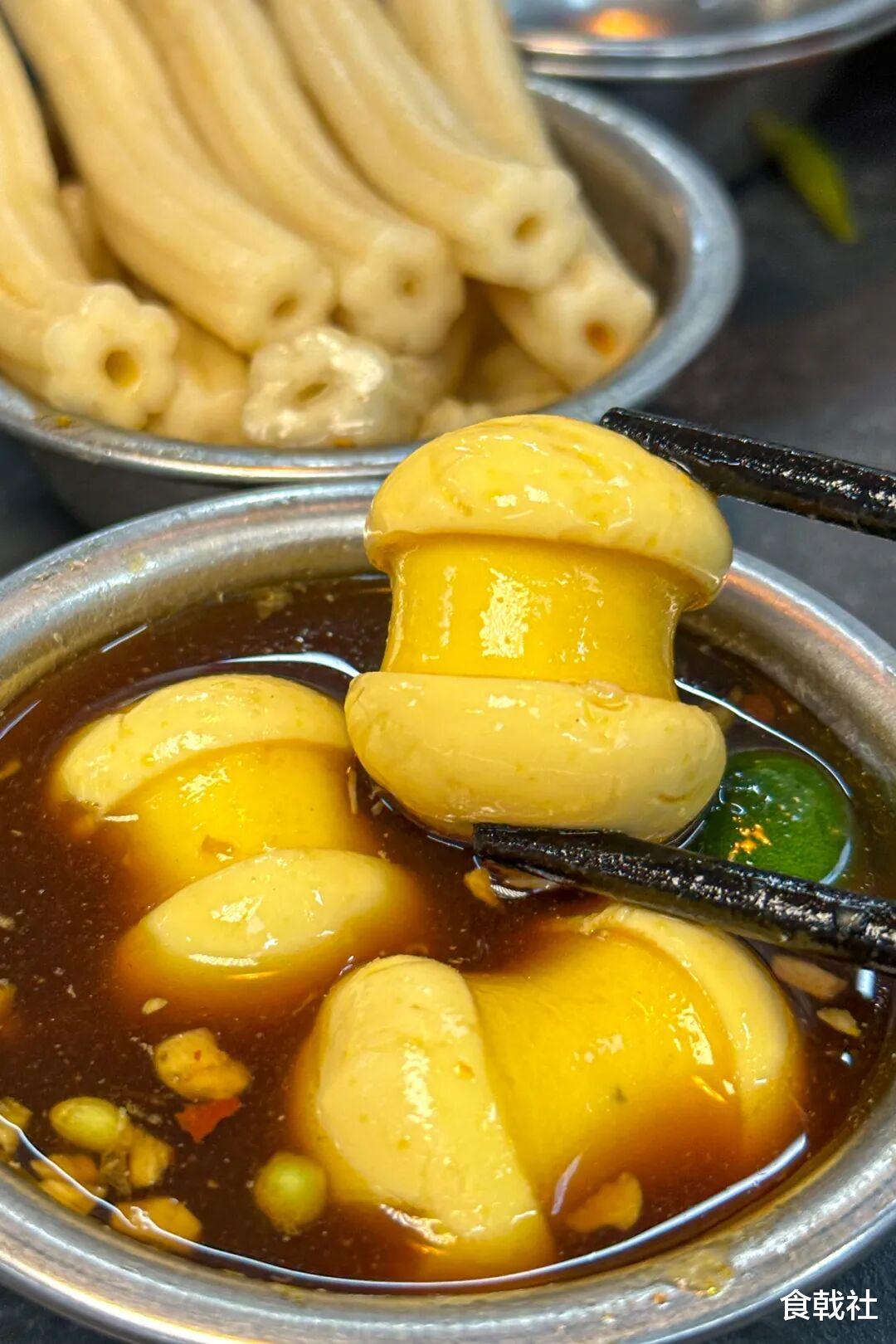如果说套肠里藏着闽地饮食的匠心技艺,那么蛋菇则蕴藏了福建人的探索精神。这道流行于闽北地区的经典风味,需将调味的蛋液灌入小肠,封口后轻柔地煮熟定型。捞出切段,再入沸水,肠衣遇热瞬间紧缩,中段的蛋液受挤压鼓出,便形成了惟妙惟肖的‘蘑菇’形状。一口咬下,蛋的嫩滑与肠的脆弹在口中交织,正是福建人化平凡为神奇的烹饪智慧。