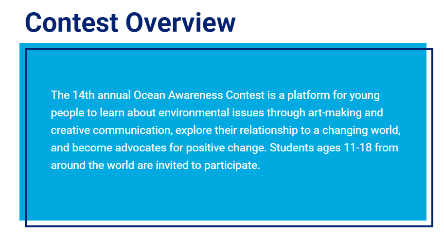 第14届年度海洋意识大赛是一个平台,让年轻人通过艺术创作和创意交流了解环境问题,探索他们与不断变化的世界的关系,并成为积极变革的倡导者。来自世界各地的11-18岁的学生被邀请参加。