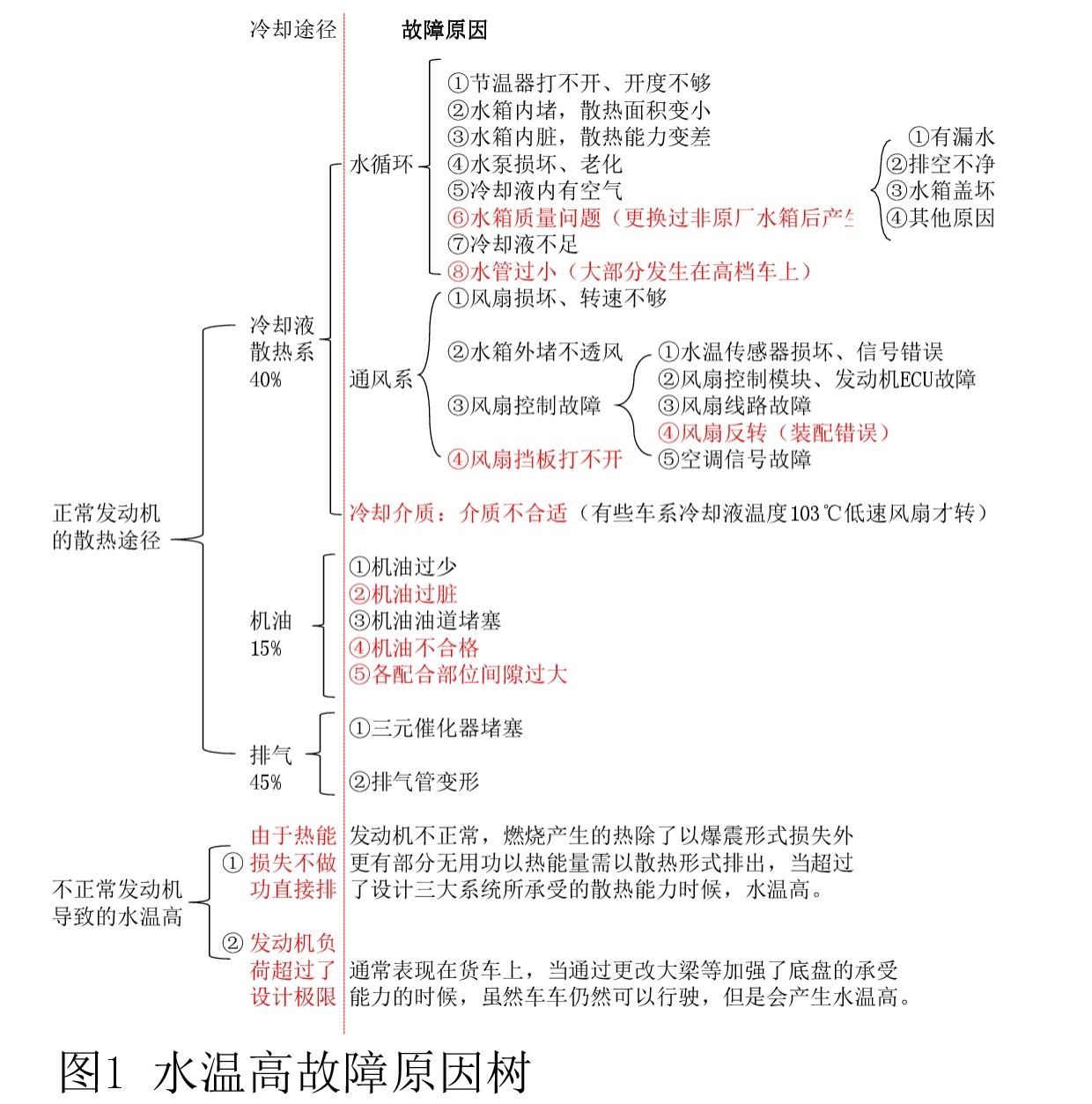 故障诊断,但是故障点是在潜意识里的假设条件里面的时候,很多技师就不能解决问题了;其次想要弄清楚水温高的原因,我们还要了解发动机的散热渠道到底有多少个,以本人的理念,发动机散热三大渠道,机油润滑系统占大概15%(包括机油泵、油底壳、有些还包括散热器等),冷却液系统大概占40%(包括冷却介质、水泵、水管、节温器、水箱、风扇及其控制系统),排气系统大概占45%(这个是大概数,没有准确依据);再次,我们意识里必须明白,三大渠道散热能力也有个总上限,三大散热渠道中每个散热渠道都有散热的上限的,由于某个渠道散热功能丧失或者部分丧失,其本应由其承担的散热功能就只能够由其他两个大渠道去承担,相当于故障发动机总的散热能力下降了,到一定负荷程度,水温高的故障现象就不可避免的出现了。由于没有对以上三条基本的条件充分认识,在平时维修过程中,大部分技师会忽略这个或者哪个故障源,在故障分支水循环中的⑧水管过小是一个大部分技师可能会忽略的因素--这种情况大部分发生在高档车上,典型的故障现象是:低转速时候水温会高,为什么呢?因为水管径小了,达到正常工作水温的时候,流经水箱的水相对于暖风箱的水按比例计少了不少,这样即使通风系无问题,也会导致低转速的时候水温略高;在风扇控制故障里,④风扇反转(装配错误)以及⑤空调信号故障也常常被许多技师所忽略。但是不管如何如果我们对照图1的水温高的的故障原因树(或者其他后果等同于图1中某个故障源的原因),图1中标记红色的故障因素,是许多技师容易忽略的,但是一句话,熟悉了图1的表所有故障原因以及等同的因素,没有理由找不到水温高的故障原因的。在所有水温高的因素里,通常,技师们考虑得比较少的还有机油散热功能(可能有部分技师认为机油只是起到润滑作用,其实在润滑过程中包含了散热的功能)与发动机非正常工作或者负荷超过了发动机设计极限时工作的水温高!例如:有辆五菱之光面包车,由于水温“高”故障,经更换了水箱、缸垫、风扇、水泵等等几乎全部东西后,问题仍得不到解决,令人奇怪的是,每次在厂里维修更换某样东西,出去试车,不管如何试车,都没有水温高的情况出现,但车主开回去使用不超3天,又反映使用过程中水温高!后来本人介入维修,询问了车主水温高的时候到底是拉了多重的东西,原来这面包车是当做货车用,拉日用品,拉了1.5吨多+3个人,这种超过了厂家设计的承受能力使用方法,是不可避免的导致水温高、并加速发动机损坏的!再如:有辆拖车,每次拖车的时候水温略高,检查了除机油以外的所有东西,结果仍问题没有解决,后来询问到机油好久没有换了,换了机油后再使用,再无水温高的现象。许多一线技师在解决水温故障的时候,根本心里不清楚发动机的散热途径到底有多少,一般,他们考虑的只是排气系与冷却液散热系,没有考虑机油方面,少考虑了一个方面,结果有些水温高故障,他们永远也弄不清楚,即使问题解决了,可能也不知道是哪里的问题!因此,本人定义的水温高为:在发动机工作过程中,由于三大散热系统中的某个或者多个散热(分)系统中有一个或者多个部件存在功能故障、或者发动机工作异常、车辆实际负荷超过了设计的极限,导致发动机工作过程中燃烧产生热能除了转化为机械转动能、震动能后的余热不能及时消除而产生水温超过了设计限度的现象。