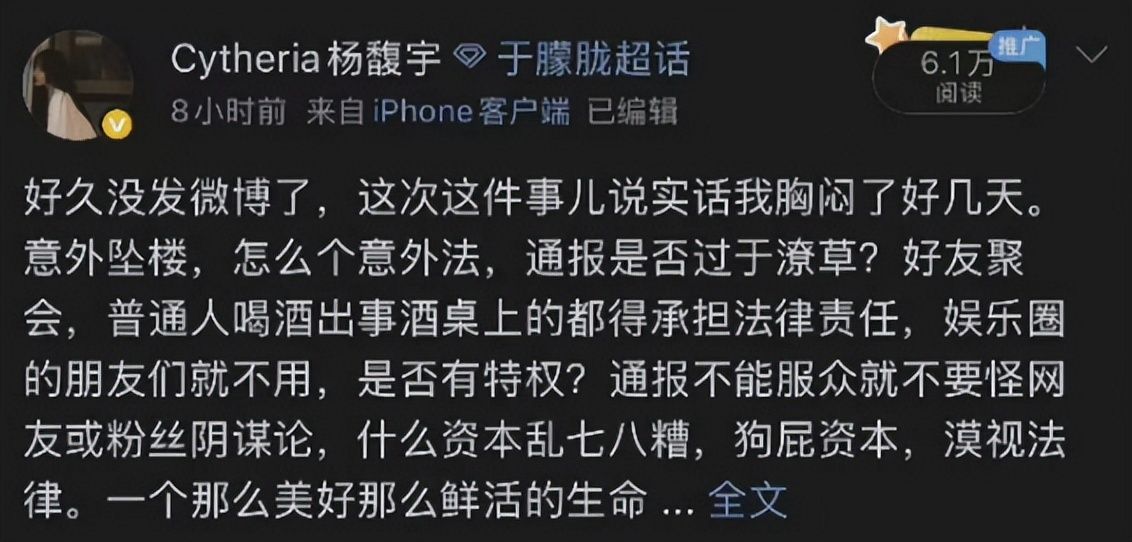 演员杨馥宇也疑惑为什么于朦胧出事后,第一个爆料的是娱记狗仔,官宣的是工作室通告,且内容只有短短几句话,是否过于潦草。