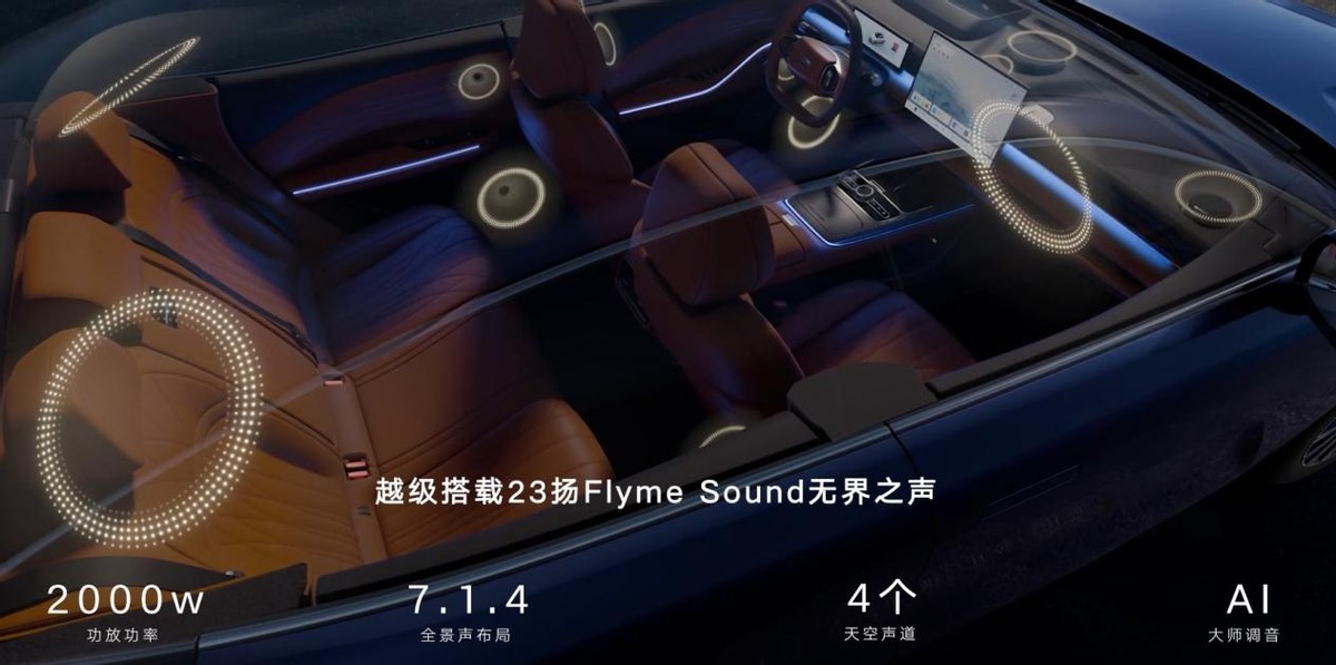 座舱豪华感直接拉满,车内配备同级唯一23扬声器FlymeSound音响系统,7.1.4全景声布局搭配2000W大功率功放,支持AI智能调音与四大虚拟场馆模式,全车每一座位都能享受沉浸式音乐厅效果。至臻VIP电动行政座椅配备通风、加热、按摩功能,536mm加长坐垫与大角度后仰调节,后排舒适度媲美豪华行政轿车。