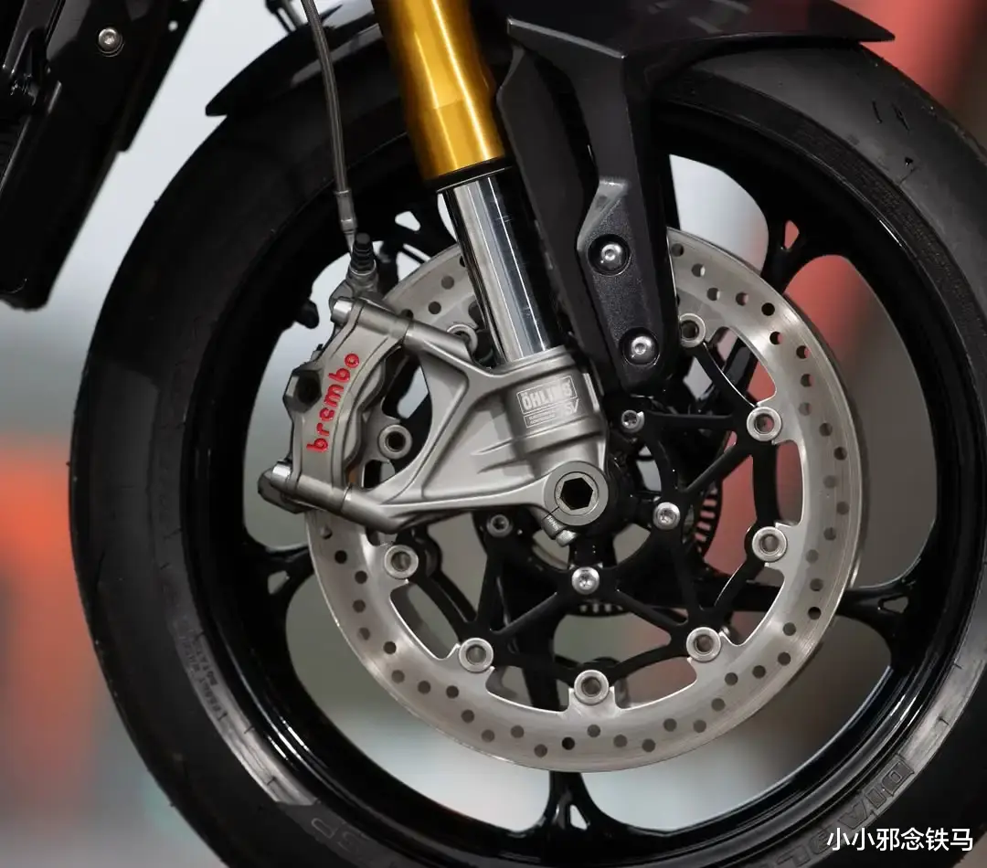 整车重量仅199公斤,在同级车型中极具优势。在底盘配置方面,新款车型与前代保持着高度的延续性。铝合金双梁车架依旧是承载车辆核心部件的坚实骨架,以出色的强度与轻量化特性支撑起整车架构。制动系统上,前轮依旧搭载高性能Brembo Stylema制动卡钳搭配320毫米刹车盘,配合RCS径向主缸,提供强劲且线性的制动效果。而轮胎部分,倍耐力Super Corser SP V3继续担当重任,以优异的抓地力与耐磨性,确保车辆在各种路况下都能保持稳定操控。