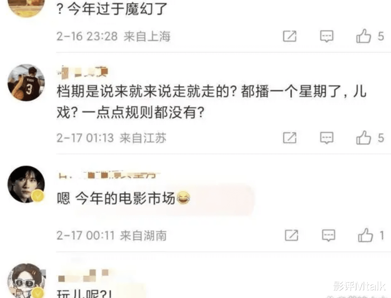 另有网友评论指出,一旦票房表现无法匹敌同期对手便匆忙撤档,期望日后卷土重来,这种做法若成常态,电影院不妨直接设立重映时段算了。他们认为此类明显带有捞金目的,上映后又迅速撤档的电影,影院应当考虑减少排片。