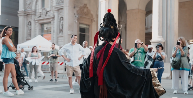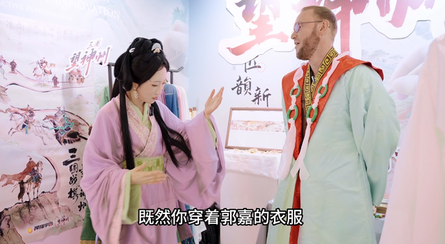 现场,众多老外对展览上陈列的游戏时装产生浓厚兴趣,自觉排队试穿,只为拍下照片发布社交媒体。其中,一位资深老外三国迷,穿上郭嘉衣服不舍得脱下,他自称是郭嘉铁粉,如今能够化身偶像本人,显得十分激动。