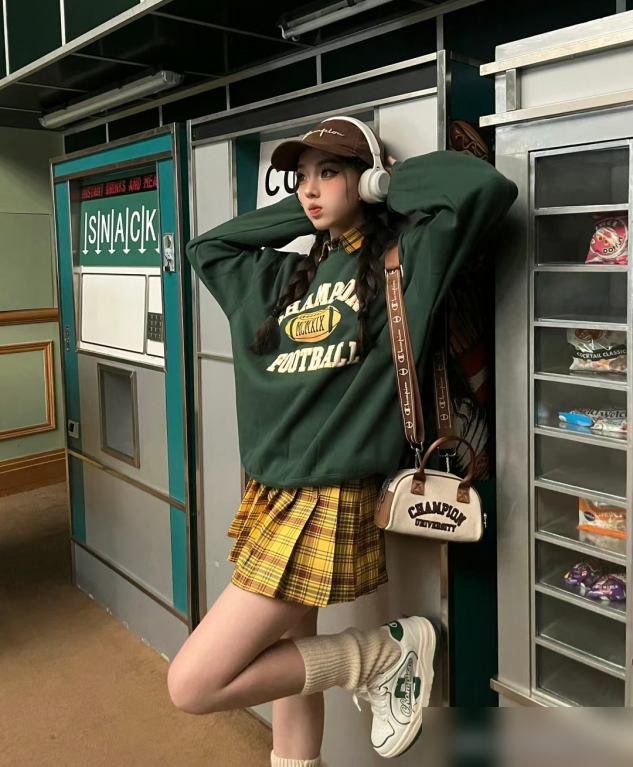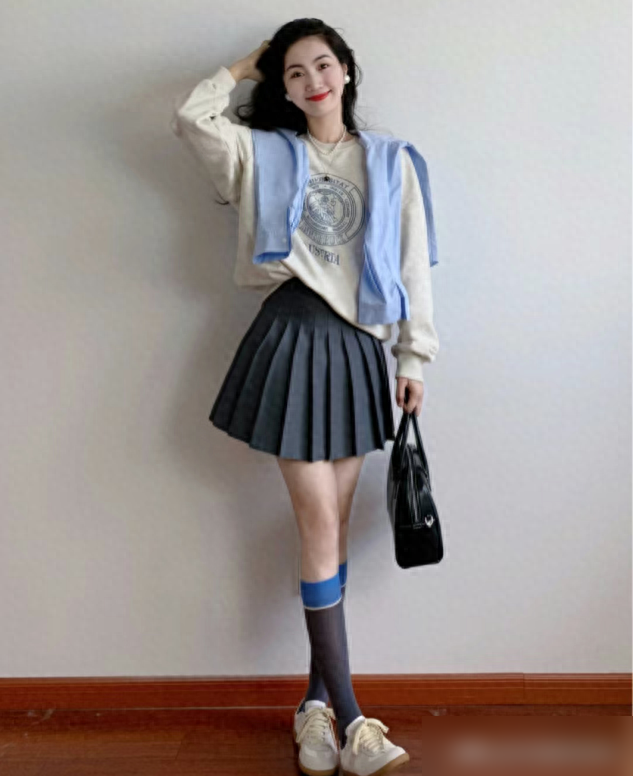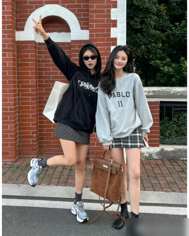 不用纠结颜色冲突,选同一色系的深浅款就行——比如米白卫衣配浅咖长裙,或者雾霾蓝卫衣配深蓝格纹裙,视觉上更和谐,还能自然拉长身材比例。