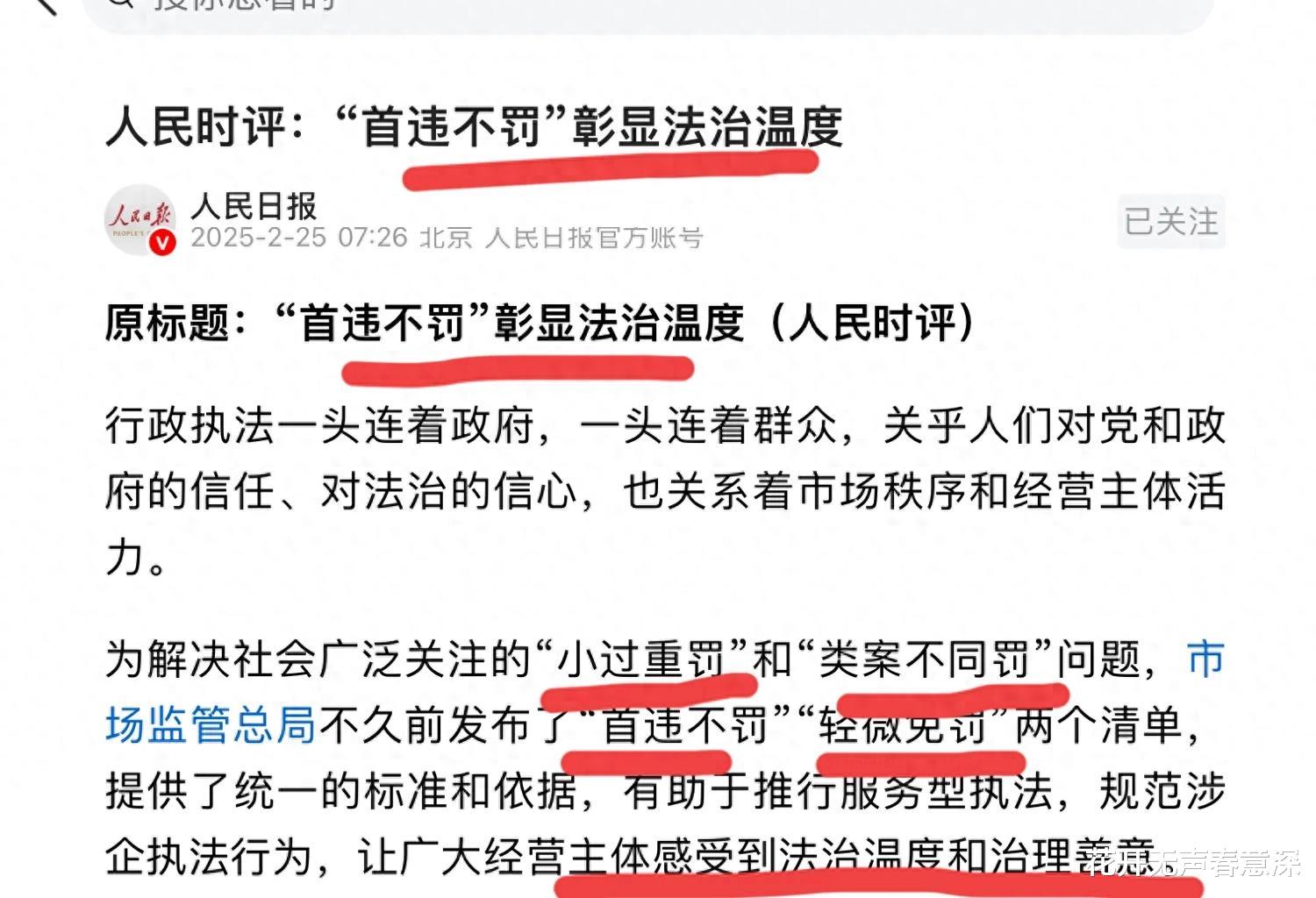 一直以来,关于“小过重罚”的事情,大家都非常关注。2月25号,人民日报发表了一篇“首违不罚,彰显法治温度”的文章,引发大家强烈的关注和热议,如果没有记错的话,这真的是官方第一次谈及“小过重罚”。什么是“小过重罚”呢,意思就是本来一些很小的过错,甚至是不知者不怪的小问题,但严格来说,可能违反了某些规定,本来是可罚不不罚的,但执法的人却把小过错进行了最大化处理,导致了小的过错,被大大的处理。在人民日报的评论看来,针对这些性质其实并不严重的小过错,小错误,要做到首次违法,不处罚,才是彰显有温度的“执法”!