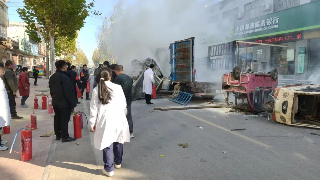 彼时,卫生院张会计在办公室处理工作时,偶然从窗外发现空中弥漫着异常浓烟,职业敏感性让她立刻警觉起来。 “不好,可能出事了!”她当即呼喊身边的医护人员,一同火速赶往大门口查看情况。抵达现场后,眼前的景象令人揪心:卡车上的三辆电车正处于猛烈燃烧状态,火势蔓延迅速,浓烟滚滚,不仅严重影响交通通行,更随时可能引发更大危险,危及周边群众的生命财产安全。