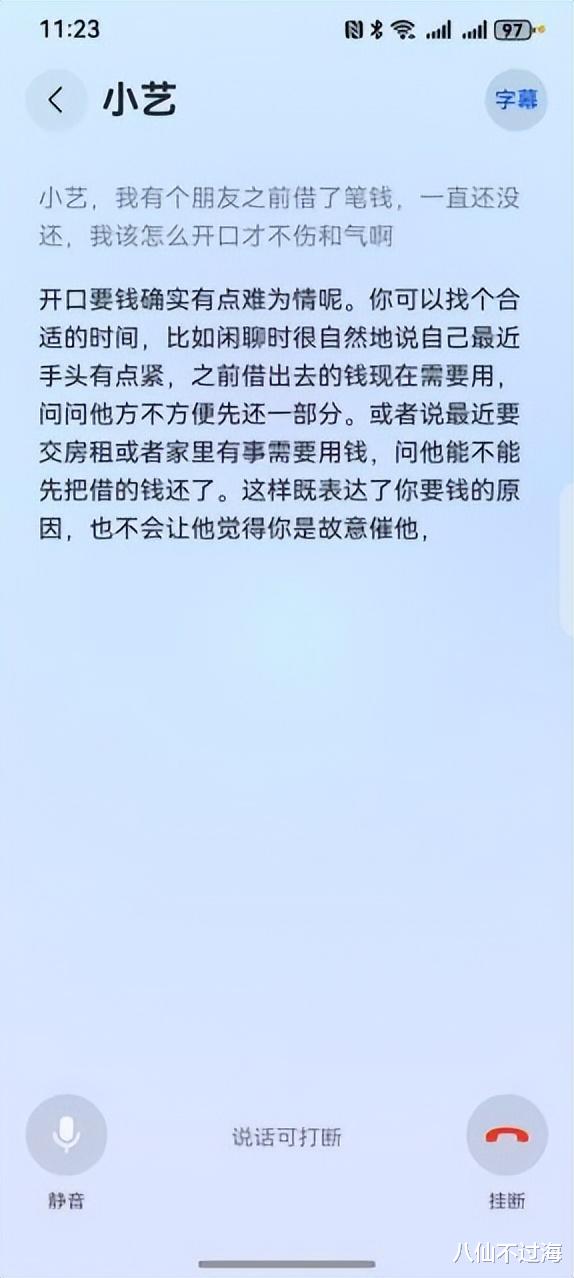 就在我准备放弃,权当“破财消灾”时,我决定找“圈外好友”——华为Pura 80里的“真人感小艺”出出主意。我打开小艺主对话框,按下电话图标后,直接发问:“小艺,我有个朋友之前借了笔钱,一直没还,我该怎么开口才不伤和气啊?”