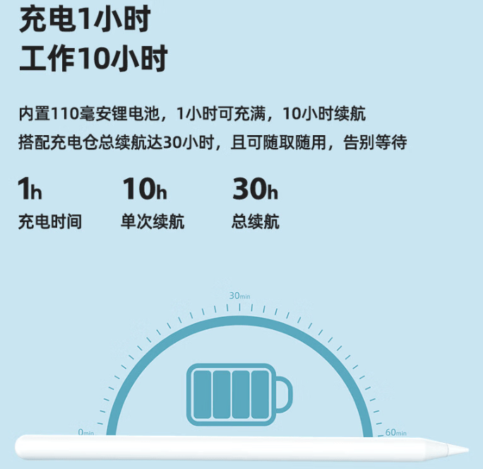 这款电容笔采用了ABS笔身,单笔重量为13g,握在手里较为轻盈舒适,握持感还算不错。在书写体验上,这款采用了可替换耐磨笔头,长时间写画也不伤屏幕,并且还具备倾斜压感和全屏防误触功能,书写时能更据需求调整笔画的粗细深浅,书写体验感还算不错。在续航方面,由于它需120分钟才能充满,充满后使用时间为7h,整体续航表现略微不足,适合对续航要求不高的创作者。但值得一提的是它的电量屏显功能,我们能直观看到剩余电量,及时为电容笔充电。