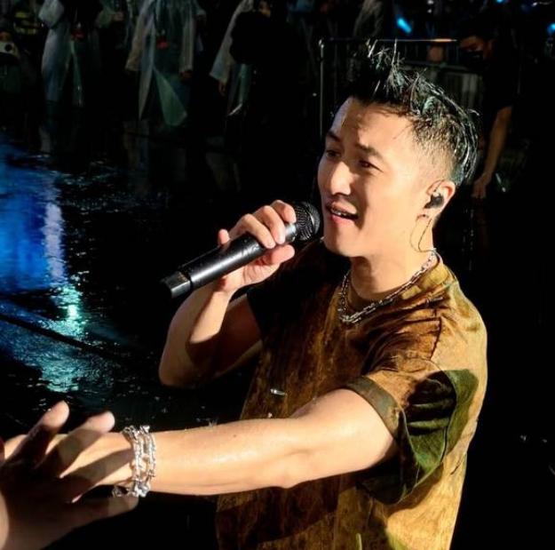 当其他艺人可能选择延期或避雨时,他毫不犹豫走进雨幕,手持话筒高歌。