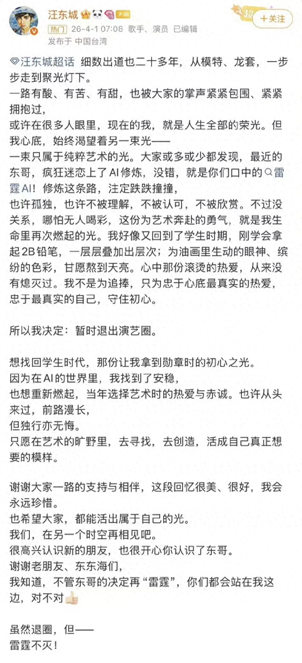 汪东城就在今天干了件大事。中午,他在微博发了一篇小作文,写得那叫一个情真意切。他回顾了自己从模特、跑龙套到演员的二十年,说自己最近迷上了搞AI艺术创作,名字叫“雷霆AI”,感觉找到了内心的安稳。他说他想重拾学生时代画画的那个梦想,所以做了一个艰难的决定,要暂时退出演艺圈。