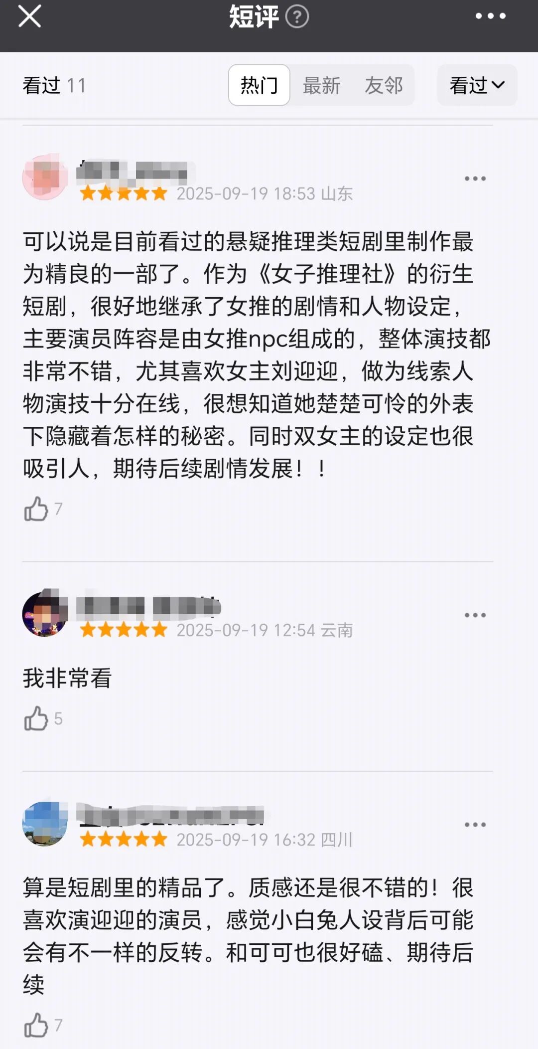 这些好评在肯定制作之外,有几条还特别提到了综艺《女子推理社》以及演员的名字,粉丝属性明显。