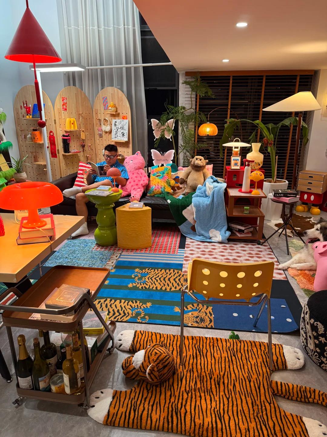 对于喜欢极繁风的无助来说,这一方小屋,应该就是童话照进现实的模样吧,彩虹色的地毯,比人还高的蘑菇摆件,五颜六色的小桌、卡通椅,还有各式各样的玩偶,随时一拍,都似进入魔法世界一样,心都变它们融化、点燃了。