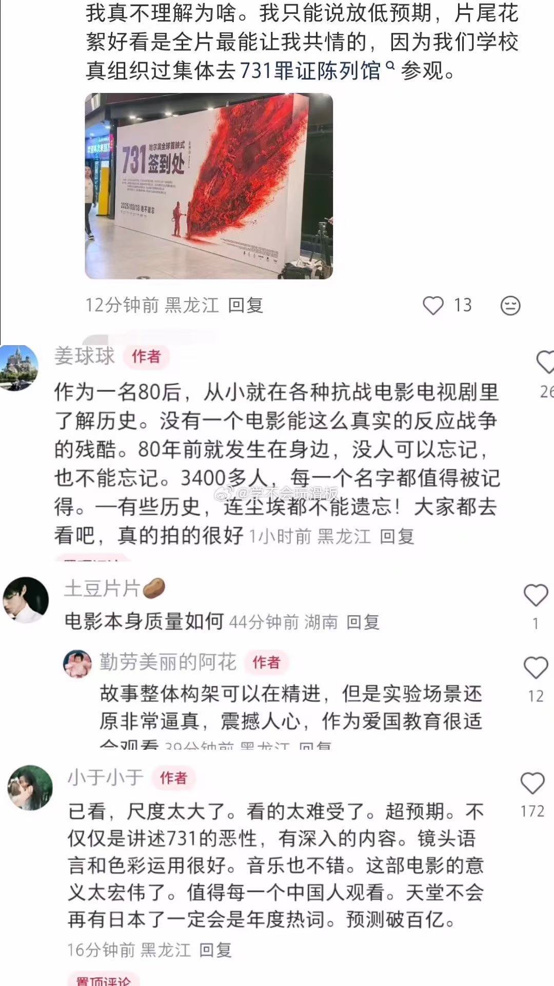 电影《731》的全球公映,不仅仅是一次观影体验,更成为了一场大规模的社会反思。各大媒体的影评文章下,最获高赞的评论不再是关于导演或演技的分析,而是"勿忘国耻,振兴中华"的铿锵誓言。观众们用行动表明,在对民族苦难的深刻记忆面前,任何单一文艺作品的得失都显得次要。大家更致力于透过银幕,传递以史为鉴、珍爱和平的坚定信念。正如一些观众所言:"走出影院阳光刺眼,恍如隔世,更珍惜当下和平。"还有观众感慨:"就算日子穷点,但至少每天都能吃得起饭,不会被饿死,不会被烧杀抢掠,没有731部队,没有万人坑。"