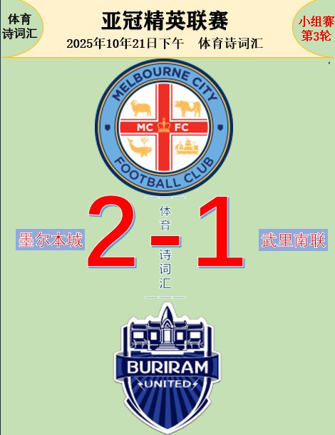 上半场两队互交白卷,武里南联尾声阶段打进一球被判无效。下半场第72分钟武里南联的乔希奇补射破门,第84分钟墨尔本城的拉沙尼小角度抽射扳平比分,也打进球队亚冠首球,至此亚冠东亚区12队全部有进球斩获了。补时阶段,卡普托帮助球队完成绝杀。