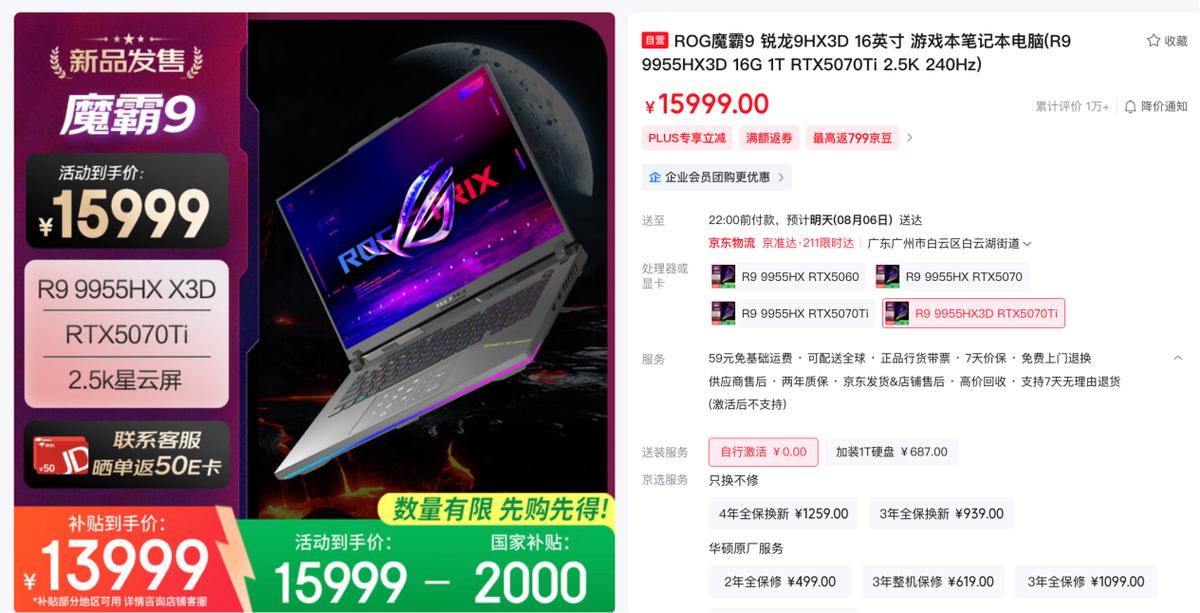 ROG魔霸9之所以上市以来人气居高不下, 得益于它拥有全面且强劲的表现以外,还拥有“香气十足”的表现,尤其是部分地区仍支持国补,ROG魔霸9国补活动下仅13999即可到手,要知道可是搭载AMD 锐龙 9 9955HX3D 移动处理器+RTX5070Ti+ROG星云屏2.0的强劲组合,是今年换新游戏本不可多得的一线品牌机型。