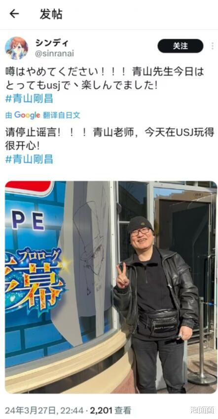随着谣言越传越离谱,有当天在大阪环球影城的日本网友在推特上辟谣,告诫不明真相的网友不要再传播谣言了,青山刚昌在大阪环球影城玩的可开心了,并附上了青山刚昌在现场的照片。
