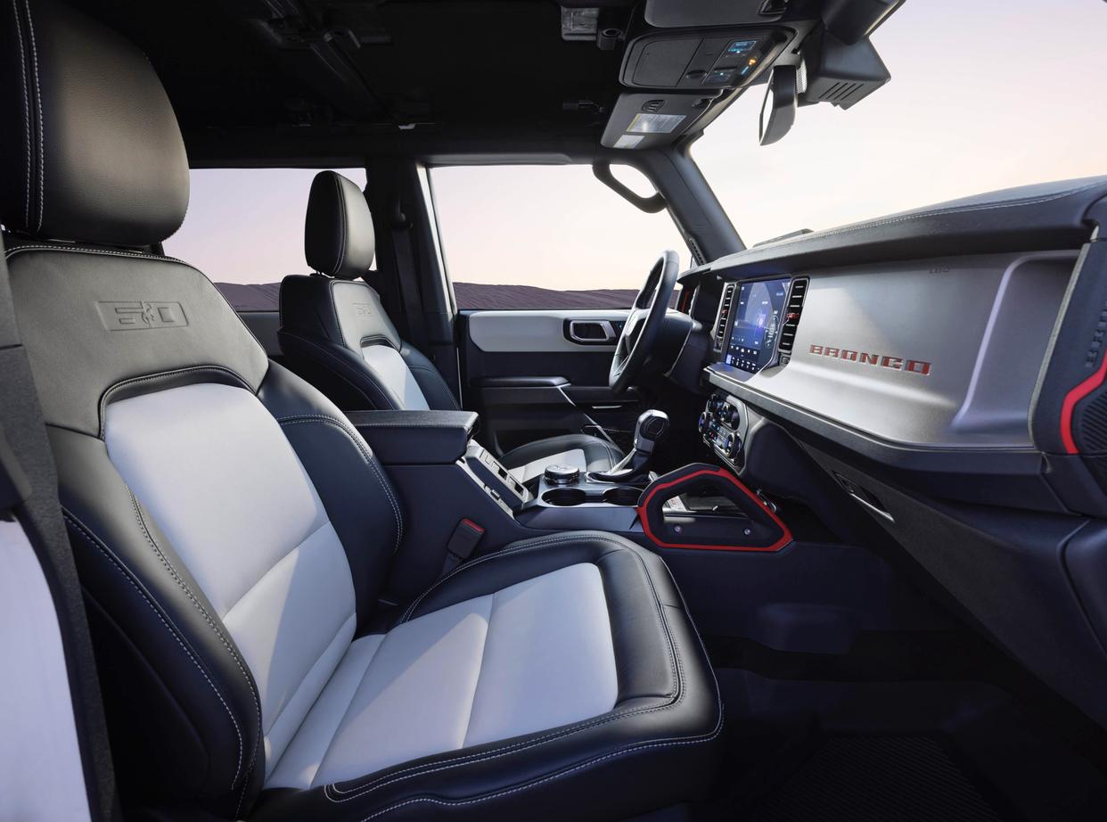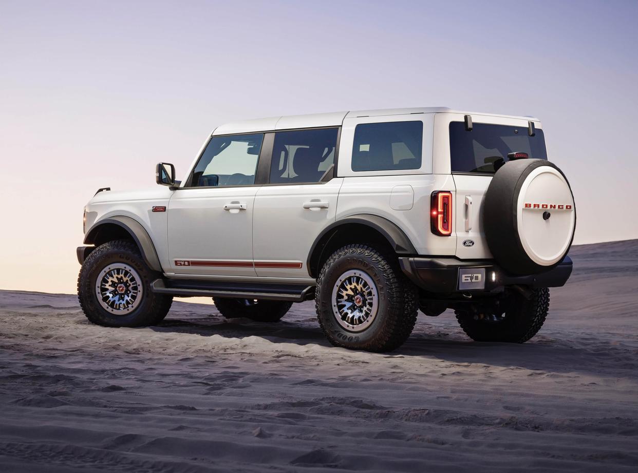 从最直观的颜值方面来看,福特烈马60周年纪念版致敬经典,采用了“时光胶囊”的设计理念,整个车头造型方正,前舱盖与整个车头一气呵成,正前方加入了下沉式的线条,一体式格栅与两侧正圆形的前大灯融为一体,中间还配备了红色的“BRONCO”车标,辨识度很高。粗犷的前包围配备了左右对称式的圆形雾灯,两个拖车钩设计以及粗犷的金属防撞梁和金属防刮擦护板,还预留了安装绞盘的空间,展现出了十足的硬派气息。车尾配备了全尺寸外挂式备胎,备胎后壳依旧配备了醒目的红色“BRONCO”尾标,尾部竖状形尾灯组设计较为复杂,侧向开启尾门以及双边四出的运动排气也没有缺席。粗犷的后包围设计也更加独特。