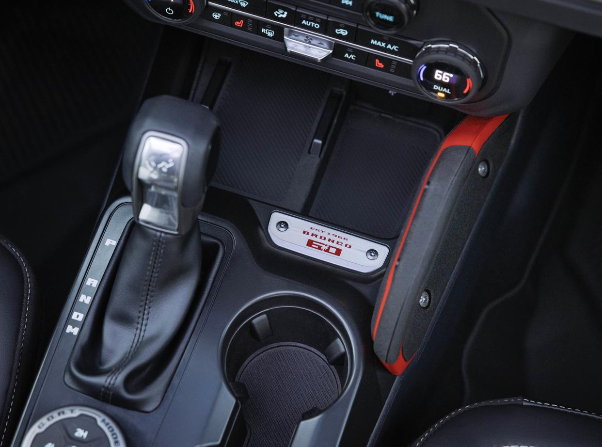 进入车内,福特烈马60周年纪念版延续了现款在售车型的经典的设计布局,大面积黑灰色翻毛皮材质的铺陈,搭配着红色的手工双缝线、红色的空调出风口装饰条、红色的安全带设计、红色的把手内侧装饰,就连方向盘的回正皮标和一键启动按钮都采用了红色的装饰。再加上大面积碳纤维装饰面板的点缀,银色钻石切割的旋钮,副驾驶手套箱装饰面包也加入了鹦鹉黄色的手工刺绣,提升了整车的档次感。座舱擦一了Alpine真皮包裹,黑檀木色外框搭配白色缝线,靠背上绣着“60”字样,双色皮革内饰扑面而来,瞬间把意境拉回黄金年代。中控台配备了四辐式多功能方向盘、全液晶仪表、内嵌式中控液晶大屏,上方是蠕行模式、三把差速锁、双闪触摸感应式按键,下方保留了很多圆形的旋钮、两驱/四驱旋钮以及别致的换挡手柄。