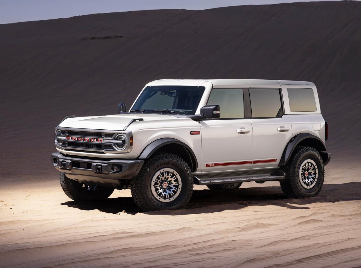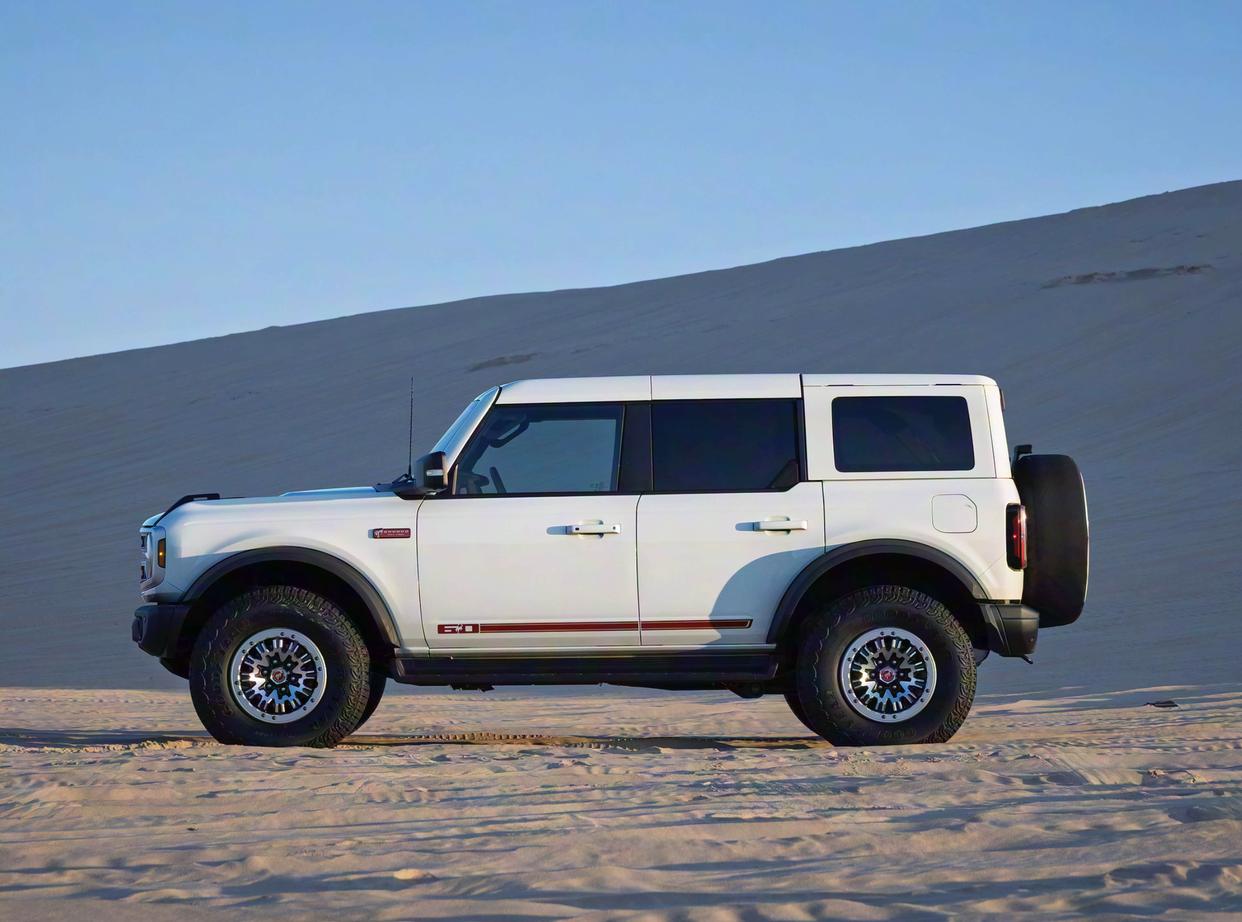 来到车色侧面,福特烈马60周年纪念版车型采用了经典的方盒子轮廓,大量横平竖直的线条勾勒,还配备了笔直的高腰线设计,四个机械式的门把手下方是朱红色贴花,前挡泥板处浮雕工艺徽章上写着“60周年”,格栅上复古字母标识与同色轮毂盖形成呼应,轮毂盖上还刻着“BuckingBronco”野马图案、“1966”字样,细节满满,每一个地方都在传递历史温度。配备的35英寸越野胎和复古套件,也带来了更强的视觉冲击力。车顶还配备了Yakima机架,十分硬派。车身尺寸方面,该车的长宽高分别为4878mm、1925mm、1734mm、轴距2850mm,属于中大型SUV车型。