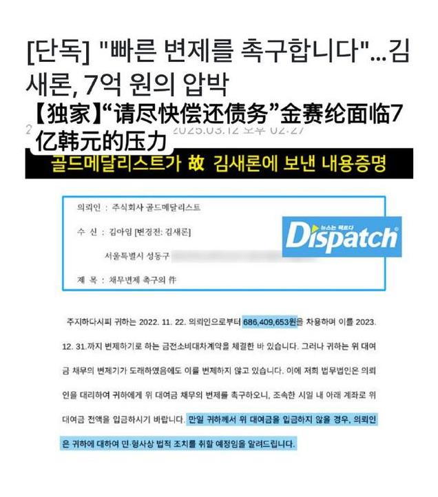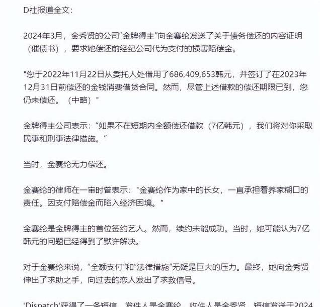 金秀贤经纪公司的声明看起来挺正规的,他们在2024年3月给金赛纶发了债务清偿证明,提醒她偿还前经纪公司代为支付的损害赔偿金,还提到她曾在2022年11月22日向委托人借款6.8亿元,并签订了至2023年12月31日抵偿的货币消费借贷合同。